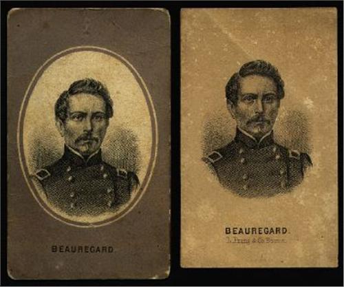 Pierre Beauregard. Interesting pair of cartes of this Confederate General, both Prang images but variant. Both in uniform, head and shoulders. One, no border, but with Prang imprint; toned. Other, no imprint but identical image within ornate gunmetal grey oval frame border. Fine image on both.