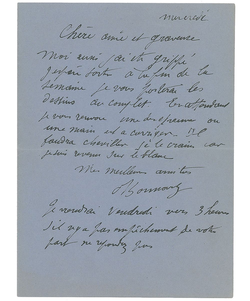 French painter and lithographer (1867–1947). He trained at the Académie Julien, then joined the group called Les Nabis, which included Denis and Vuillard, with whom he formed the intimist group. ALS in French, signed “Bonnard,” one page, 4.75 x 6.5, no date. Untranslated letter to a friend. In fine condition.