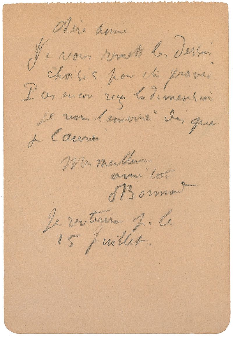 French painter and lithographer (1867–1947). He trained at the Académie Julien, then joined the group called Les Nabis, which included Denis and Vuillard, with whom he formed the intimist group. ALS, in pencil, in French, signed “Bonnard,” one page, 5 x 7, July 15. Untranslated letter to a friend. In fine condition, with scattered creases and a mild shade of overall toning.