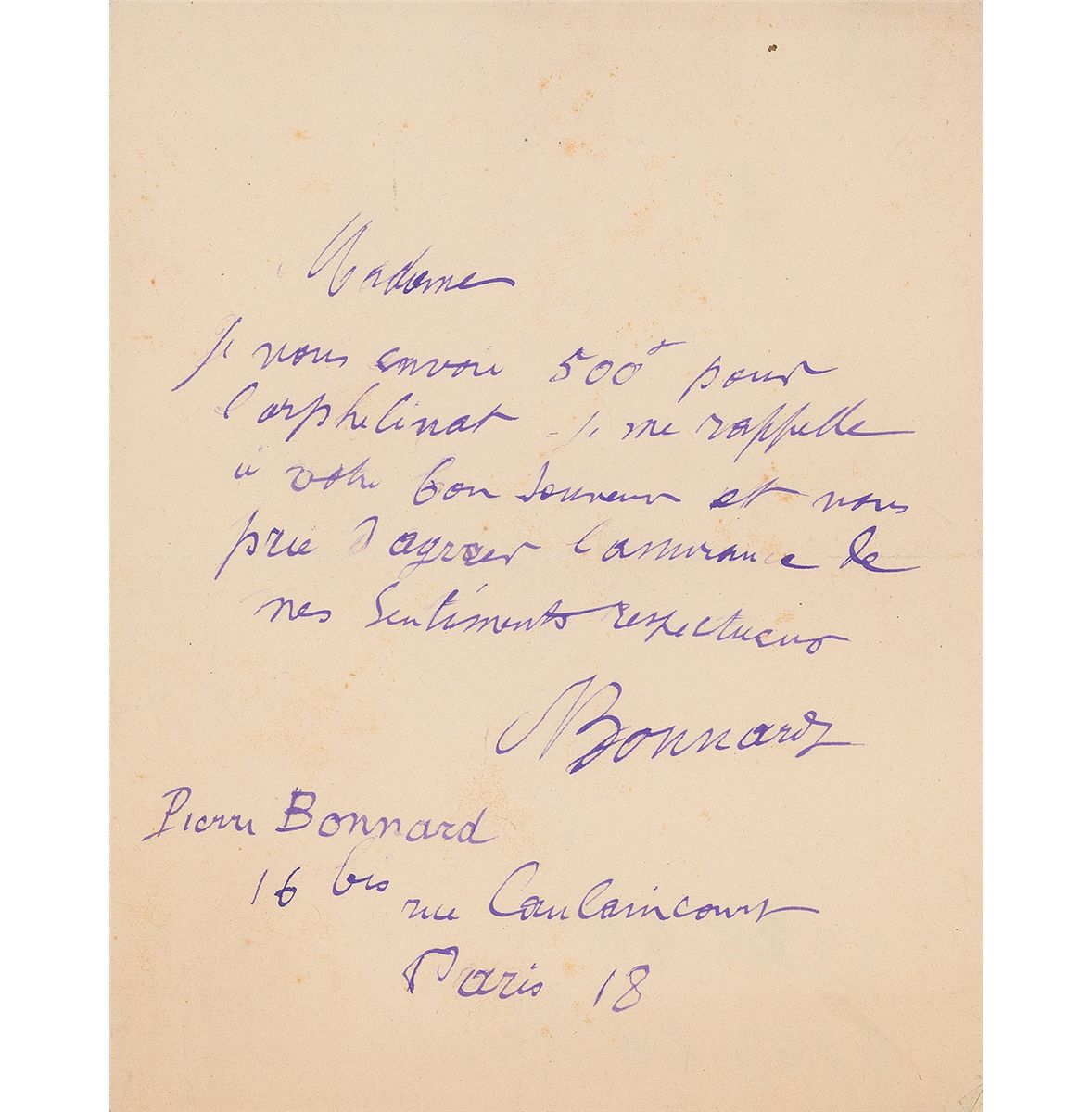 French painter and lithographer (1867–1947). He trained at the Académie Julien, then joined the group called Les Nabis, which included Denis and Vuillard, with whom he formed the intimist group. ALS in French, signed “Bonnard,” one page, 5.5 x 7, no date. Untranslated letter to a woman, boldly signed at the conclusion by Bonnard, with the artist’s name and address written along the bottom in an unknown hand. In fine condition, with central horizontal and vertical folds, a few wrinkles, and a bit of mild toning.