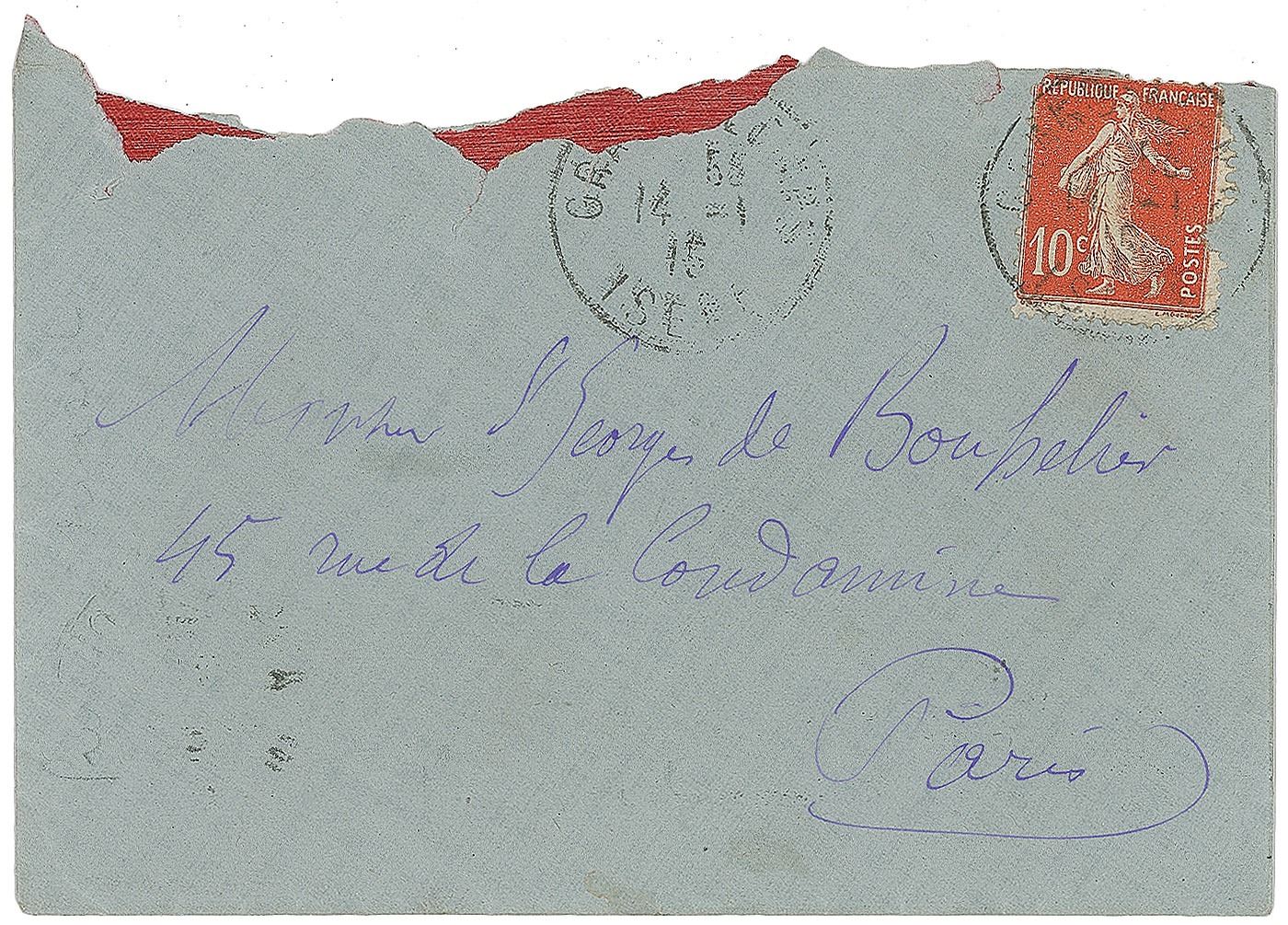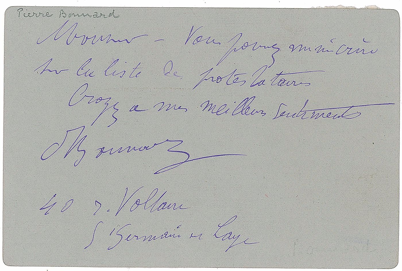 French painter and lithographer (1867–1947) who trained at the Academie Julien, then joined the group called Les Nabis, which included Denis and Vuillard, with whom he formed the Intimist group. Untranslated ANS in French, signed “Bonnard,” one page, 4.5 x 3, no date. In fine condition, with old mounting traces on the reverse. Accompanied by the original mailing envelope addressed in Bonnard's hand.
