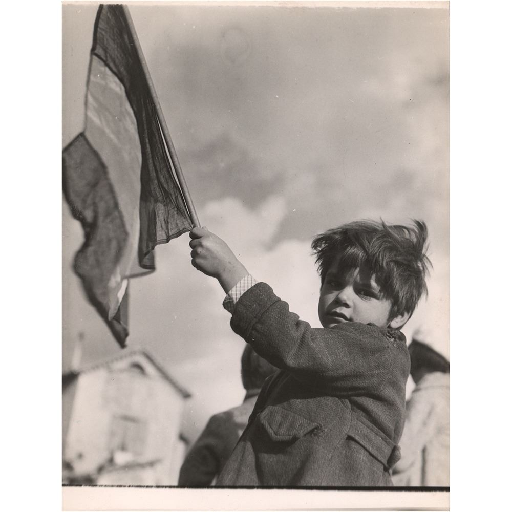 Rare original semi-glossy 7.25 x 9.5 silver gelatin photo by acclaimed French photographer Pierre Boucher, which depicts a young boy staring into the camera and holding a French flag during Liberation of Paris festivities in late August 1944. Signed on the reverse blue pencil, ‰ÛÏP. Boucher.‰Û In fine condition, with trimmed edges.