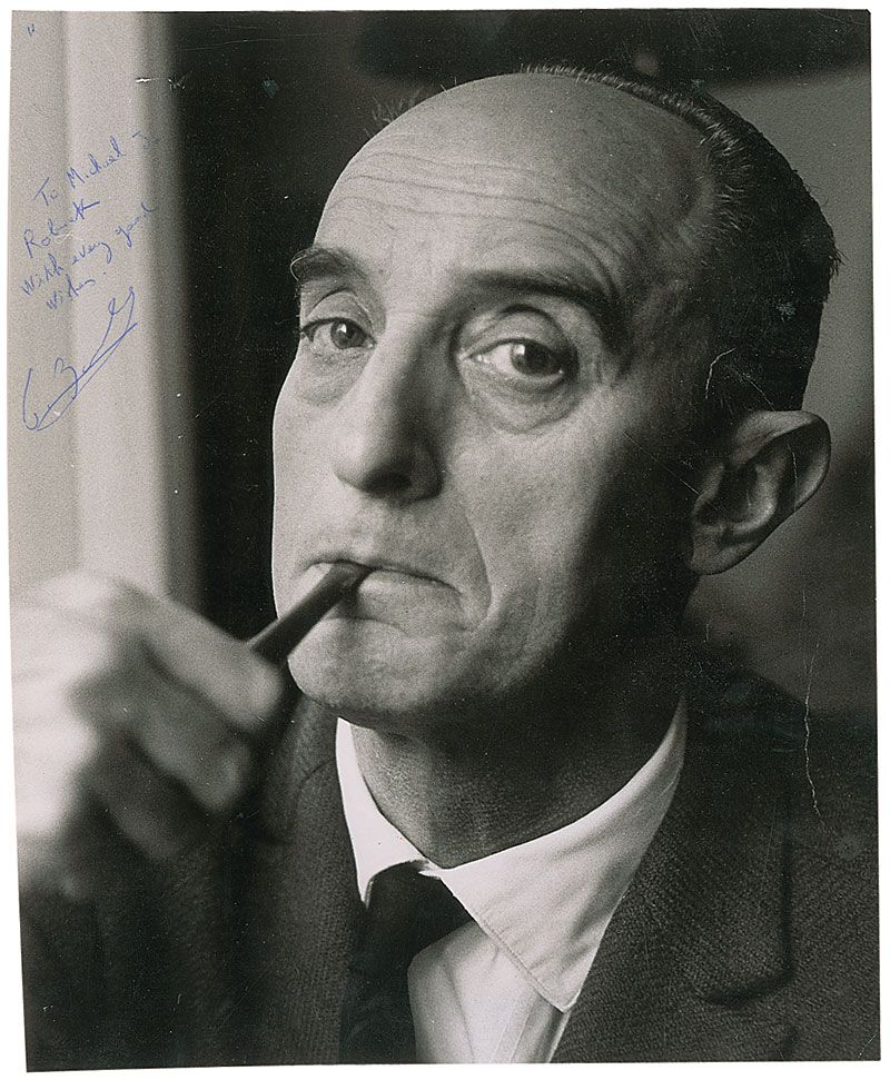 French novelist best known for authoring The Bridge over the River Kwai and Planet of the Apes (1912–1994). Pearl-finish 8.75 x 10.5 portrait, signed and inscribed in blue ballpoint, “To Michael J. Robuck, with every good wish, P. Boulle.” Reverse bears a 1971 date notation and original news stamps. In very good condition, with noticeable creasing to borders, slight overall rippling, and lightly trimmed edges.