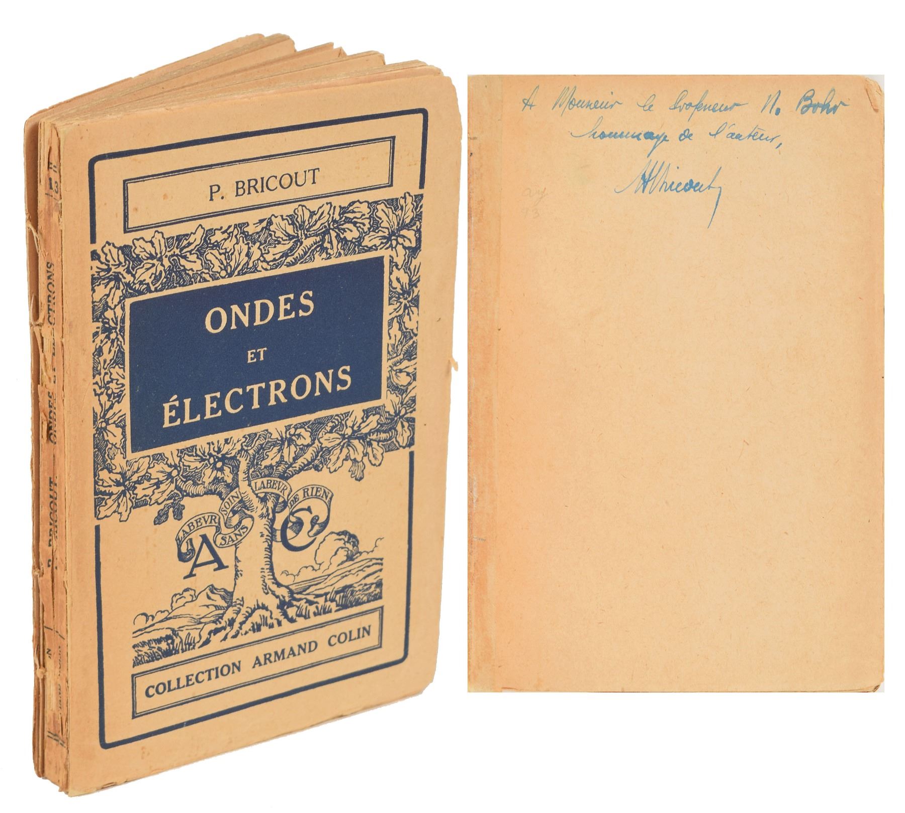 Signed book: Ondes et Electrons [Waves and Electrons] by Pierre Bricout. First edition. Paris: Librairie Armand Colin, 1929. Softcover, 4.5 x 6.75, 215 pages. Signed and inscribed on the first free end page in ink, "A Monsieur le Professeur N. Bohr, hommage de l'auteur, P. Bricout." The half-title page bears a stamped facsimile signature of Bohr, indicating that the volume originates from his personal library. Autographic condition: fine, with light toning. Book condition: G+/None, with general wear, chipping and losses to spine, and the front hinge reinforced with tape.
