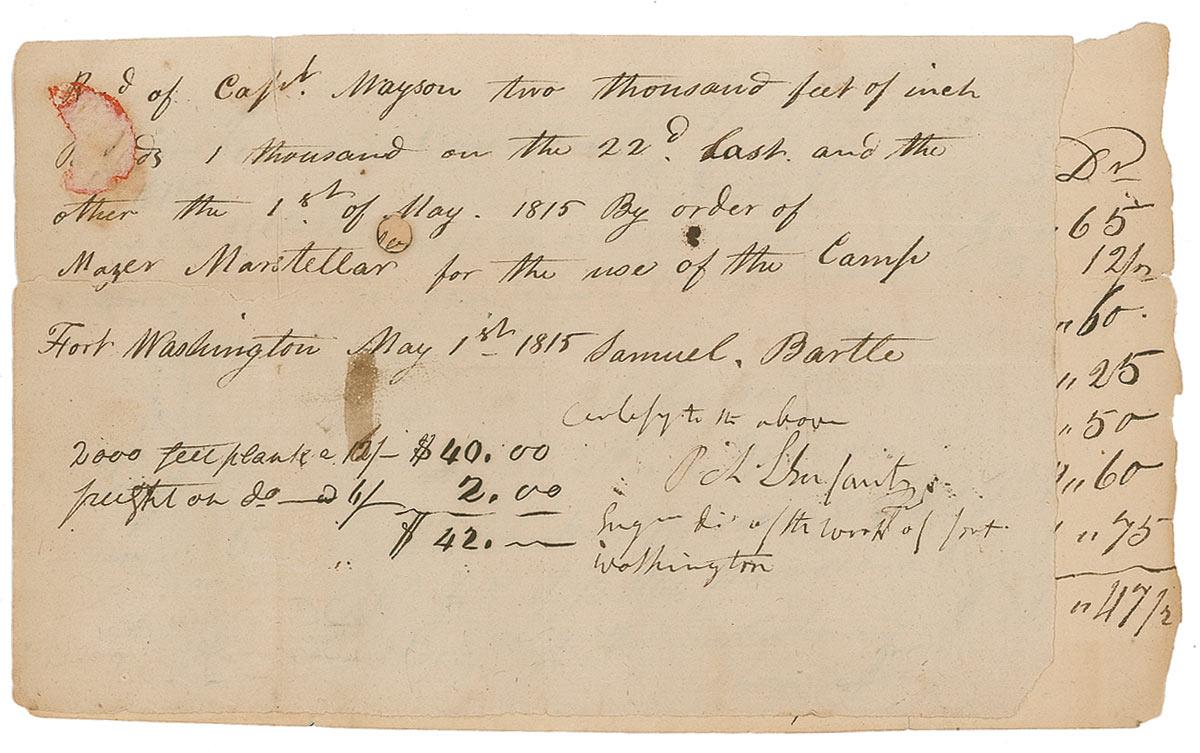 French-born architect and civil engineer (1754–1825) best known for designing the layout of the streets of Washington, D.C. Handwritten and signed endorsement, signed “P ch L’Enfant,” at the conclsuion of a one page 7.25 x 4.5 document, dated May 1, 1815. At the bottom of a receipt for 2000 feet of boards “for use of the Camp,” L’Enfant writes: “Certify to the above/ P ch L’Enfant, engineer of the work of fort Washington.” Affixed to the reverse by wax is an itemized list for other supplies issued. In very good condition, with intersecting folds, one through a single letter of signature, two small holes to document, mild toning and soiling, and a few ink marks.