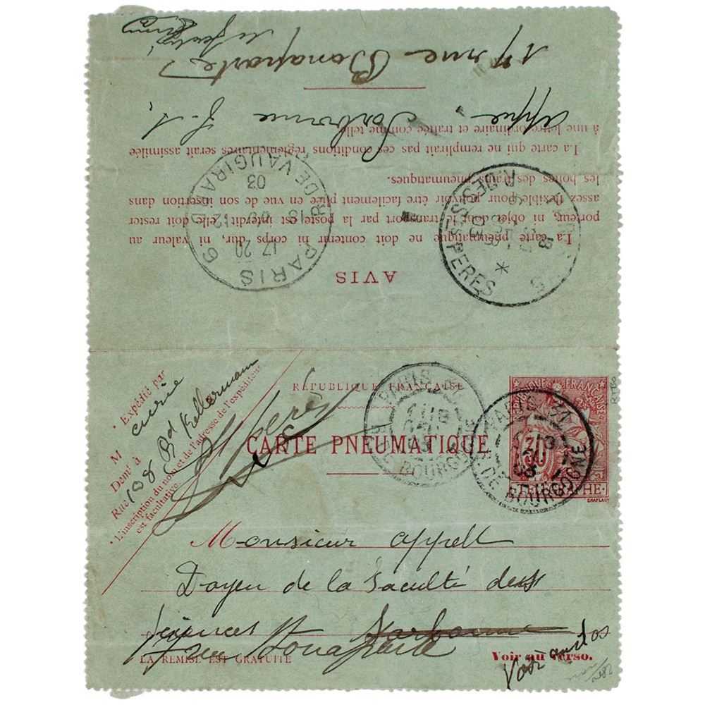 ALS in French, signed “P. Curie,” one page, postmarked December 18, 1903. Letter to mathematician Paul Emile Appell, in full (translated): "I have just seen Mr. Brusson and I have arranged a meeting for Monday morning at 11:00 at his house 29 rue Lauriston. If this time is convenient to you, I will come and pick you up by car Monday morning at 10:15 at the Sorbonne or at your house if you prefer." Addressed on the reverse in Curie's hand, incorporating his surname in the return address: "Curie, 108 Rd Kellerman." In fine condition. Accompanied by a full letter of authenticity from PSA/DNA.