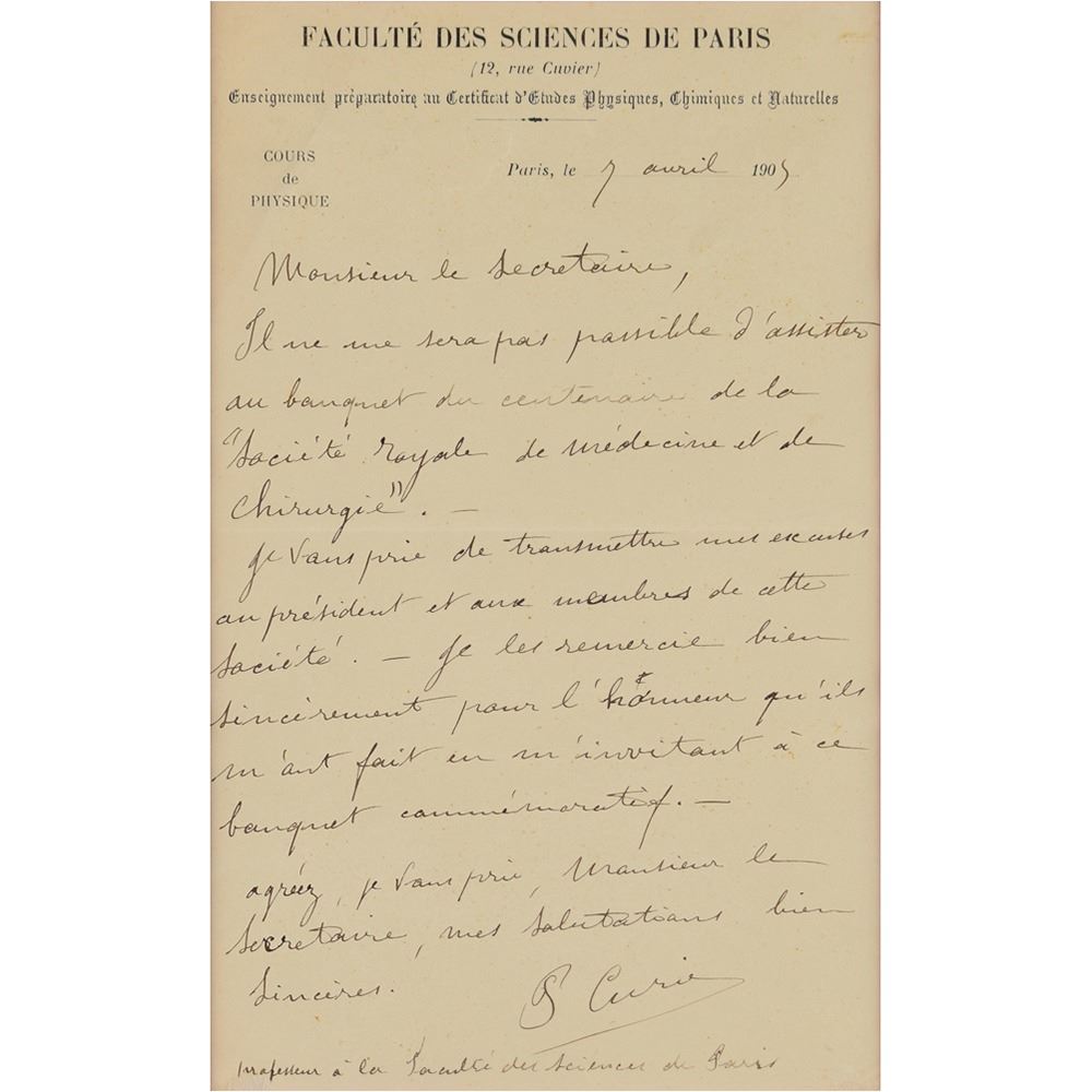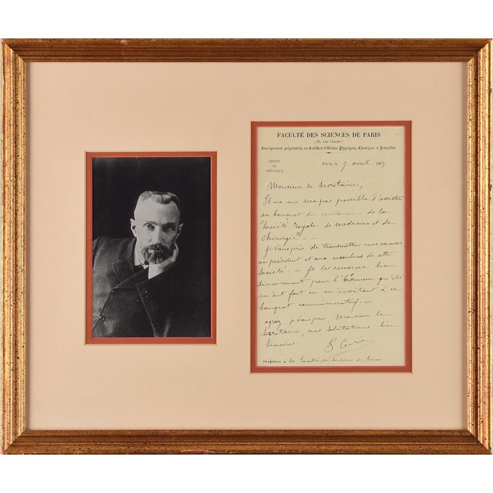 ALS in French, signed “P. Curie,” one page, 5 x 8, Faculte de Sciences de Paris letterhead, April 7, 1905. Letter to the secretary of the Royal Society of Surgery and Medicine, in full (translated): "It will not be possible for me to attend the banquet marking the centenary of the 'Royal Society of Surgery and Medicine.'—I beg you to transmit my excuses to the president and members of the Society.—I thank them very sincerely for the honor that they have done me by inviting me to this anniversary banquet. I beg you to accept, Monsieur Secretary, my most sincere salutations." Handsomely double-matted and framed with a portrait to an overall size of 16 x 13.5. In fine condition.