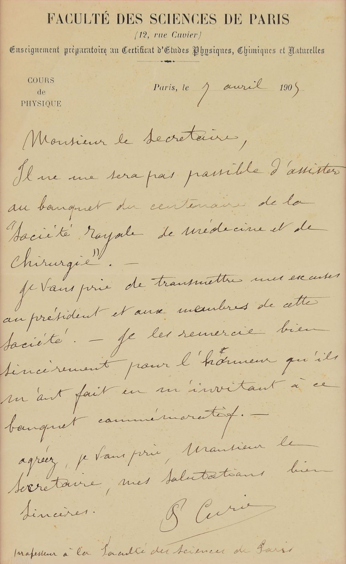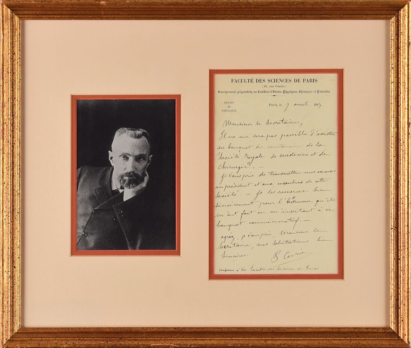 French physicist (1859–1906), best known for his pioneering investigation of radioactivity, who shared the 1903 Nobel Prize in Physics with his wife, Marie Curie. ALS in French, signed “P. Curie,” one page, 5 x 8, Faculte de Sciences de Paris letterhead, April 7, 1905. Letter to the secretary of the Royal Society of Surgery and Medicine, in full (translated): "It will not be possible for me to attend the banquet marking the centenary of the 'Royal Society of Surgery and Medicine.'—I beg you to transmit my excuses to the president and members of the Society.—I thank them very sincerely for the honor that they have done me by inviting me to this anniversary banquet. I beg you to accept, Monsieur Secretary, my most sincere salutations." Handsomely double-matted and framed with a portrait to an overall size of 16 x 13.5. In fine condition.