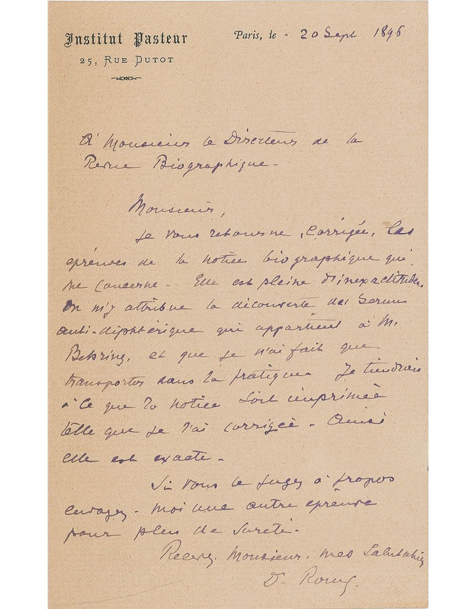 Bacteriologist (1853–1933). He studied at Clermont-Ferrand, became assistant to Pasteur, and was appointed his successor. In 1894 he helped to discover diphtheria antitoxin, and also worked on rabies and anthrax. ALS in French, signed “D. Roux,” one page, 4.25 x 7, Institut Pasteur letterhead, September 20, 1895. Letter to the director of the Biographical Review. In part (translated): “I’m returning to you the corrected proofs of the biographical notice concerning me. It is full of errors. The discovery of an anti-diptheria Serum is attributed to me. It is Mr. Behring’s [Emil Adolf von Behring discovered diphtheria antitoxin in 1890]. All I did was make practical application of it. I insist on the notice being printed just as I have corrected it. That way it’s exact.” In fine condition, with a mild shade of toning, a bit heavier to left edge.