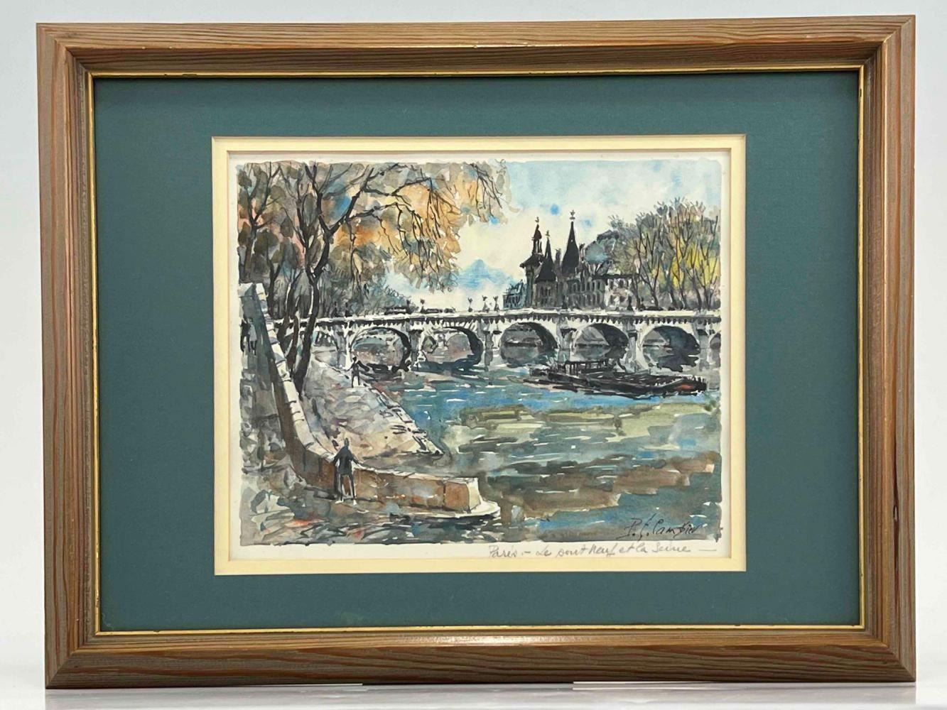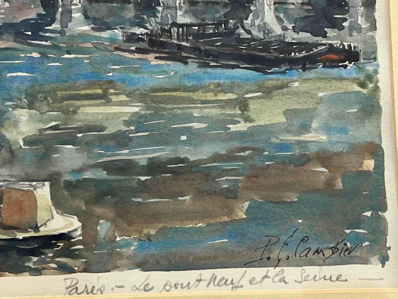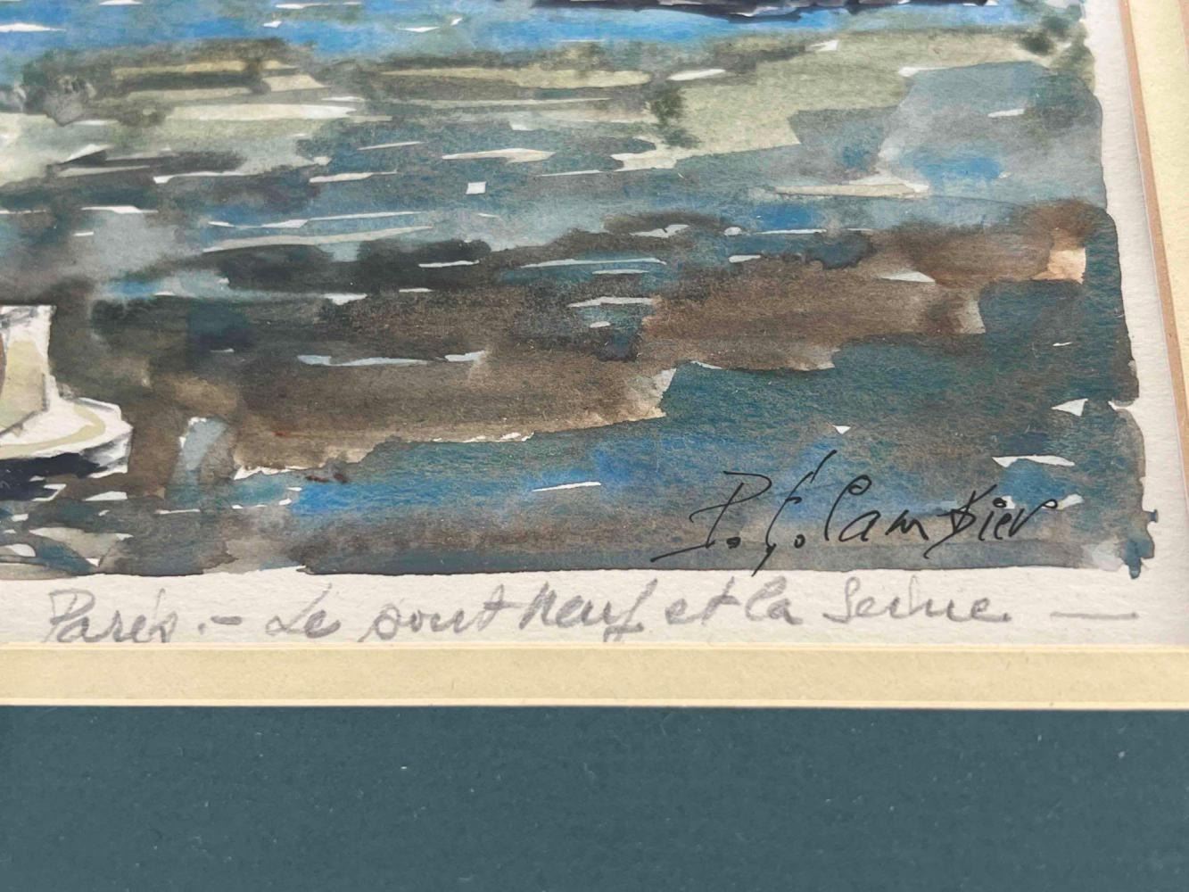 Paris Watercolor Cityscape Painting Titled Paris Le Pont Neuf Et La Seine, Signed P.E. Cambier. Approximately 15.75L x 12.25W in. Sight Approximately 9.0L x 7.5W in.