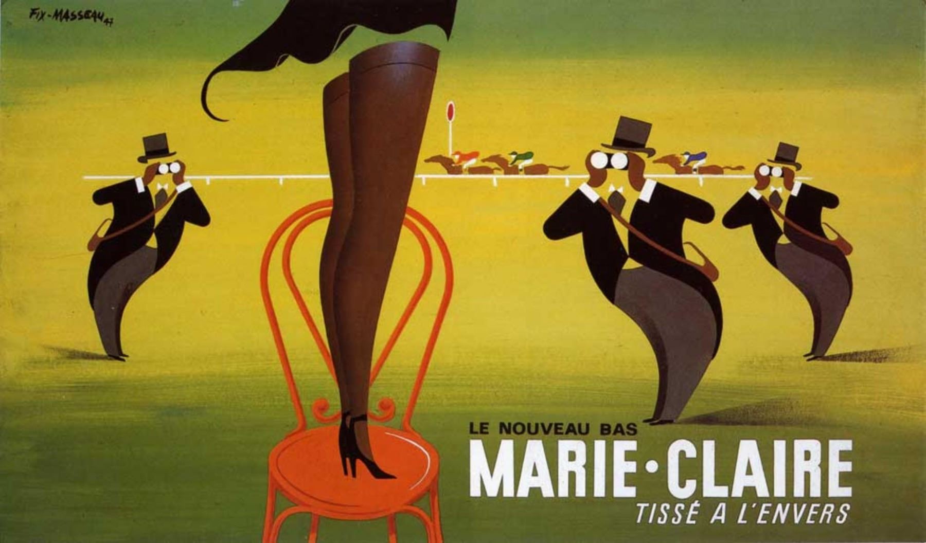 Artist: Pierre Fix Masseau - Title: Le Nouveau Bas Marie Claire - Medium: Fine Art Reproduction Giclee on Canvas - Image Size: Approximately 11.75 inches x 20 inches - Framed: Unframed on Unstretched Canvas - Pierre Fix-Masseau (1905 -1994), was a French designer, poster artist and lithographer. - Fix-Masseau created posters for Air France, Philips, Seita, Bic, the National Lottery and the Venice Simplon Orient Express. His works are exhibited in many museums including the Museum of Decorative Arts - Advertising, The Louvre, Paris, France and the Minneapolis Institute of Art, Minneapolis, United States.