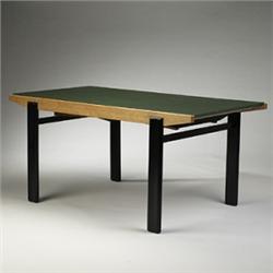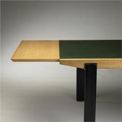 Pierre Guariche extension dining table Airborne France, 1950s maple, leather, enameled steel 63"w x 35"d x 29"h Innovative design with two 16" concealed extensions that slide out from underneath the leather top.