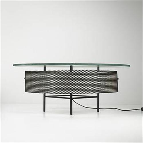Pierre Guariche illuminated table Disderot France, c. 1950 perforated and enameled metal, glass 26.75"dia x 11.75"h