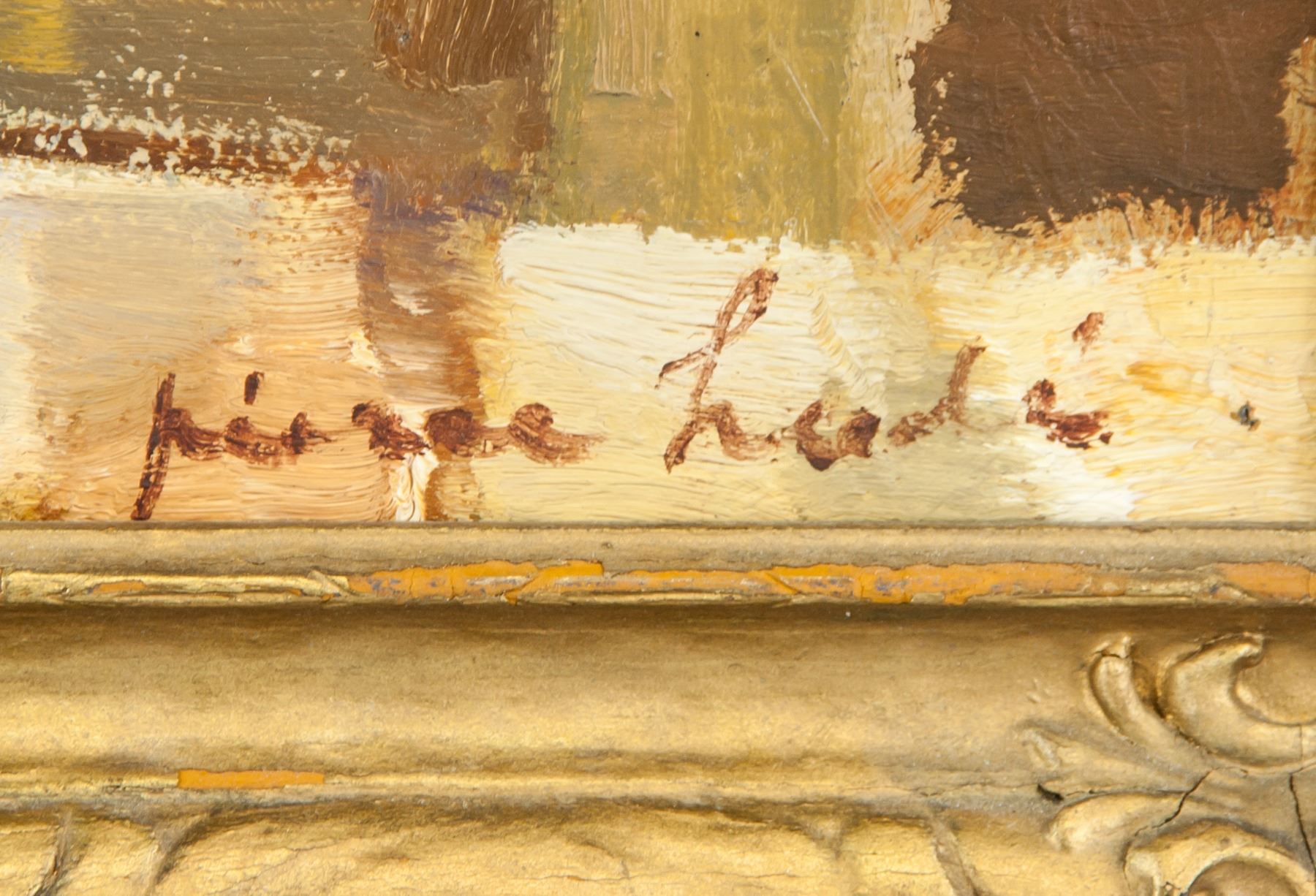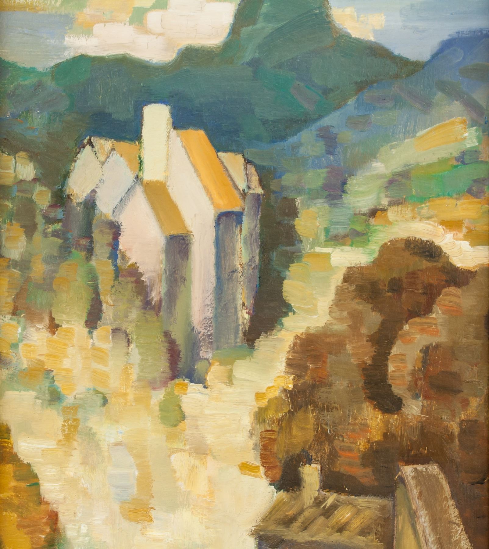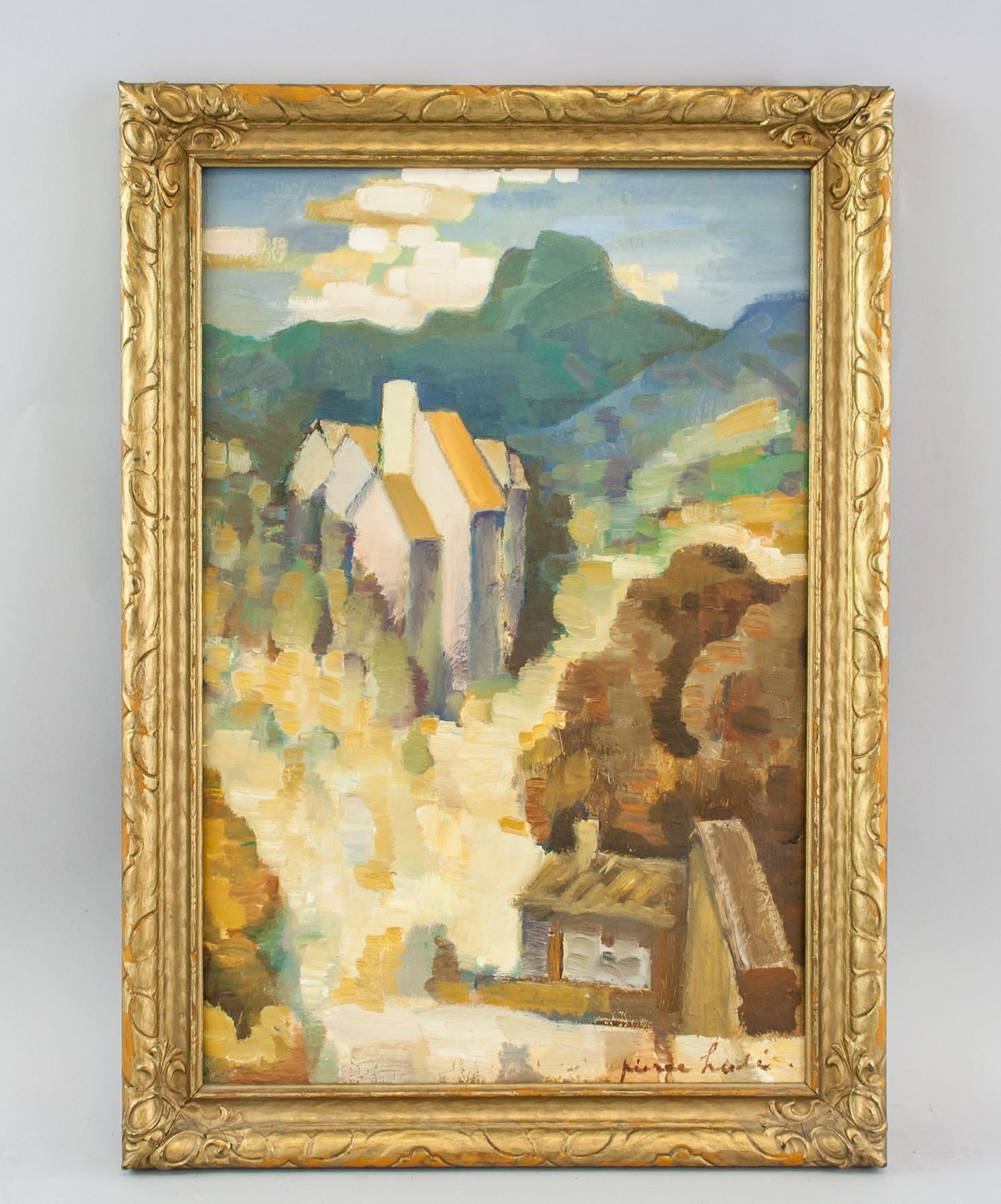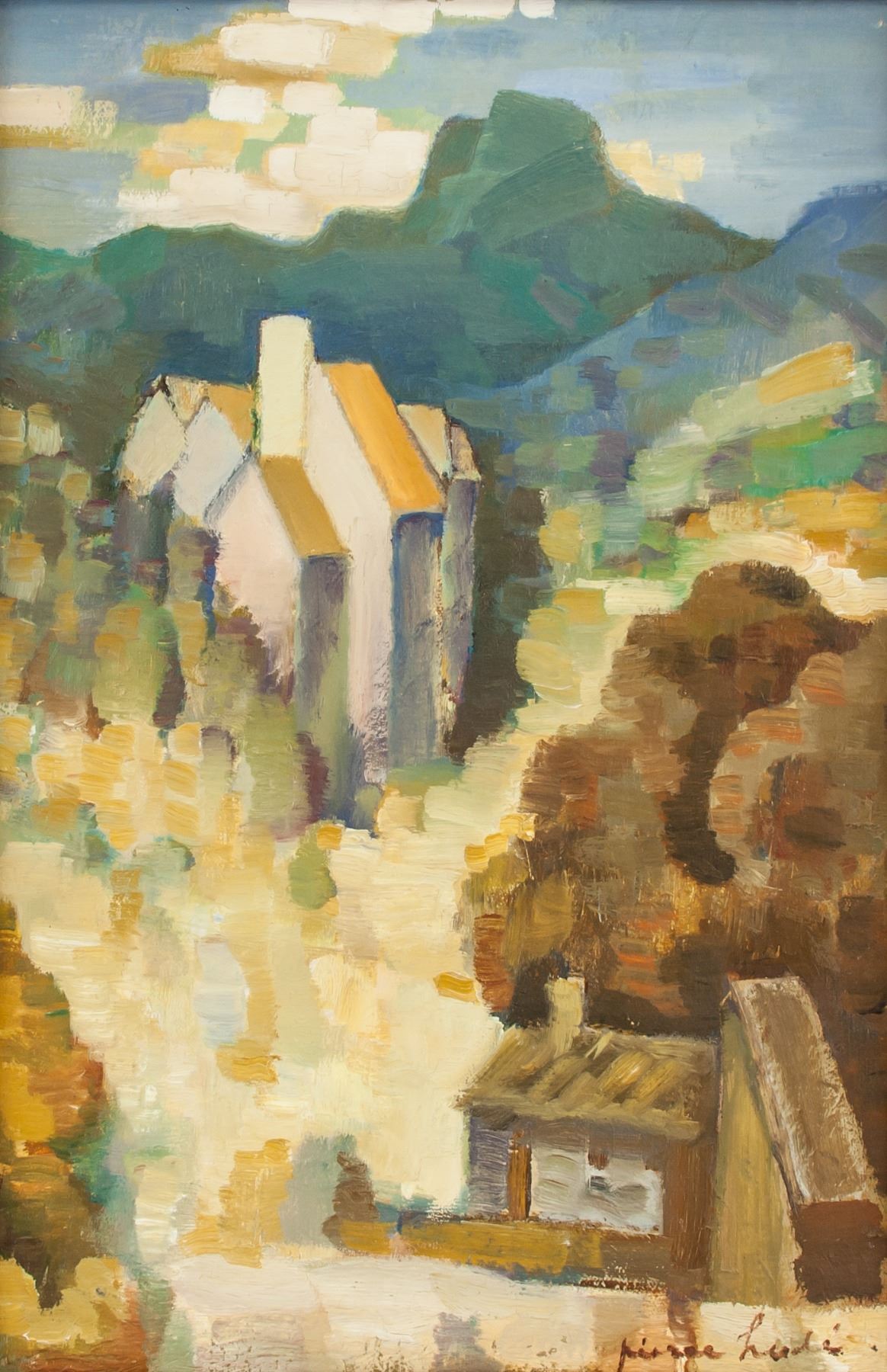 Oil on canvas painting, featuring a mountain valley landscape cubist scene. Signed and attr. Pierre Hode (French, 1889-1942). 17.5 x 11.5 inch (44.45 x 29.21 cm). Pierre Hode is known as a cubist painter where most of his paintings are centered around Normandy, his hometown and birthplace. PROVENANCE: Southern Ontario Estate