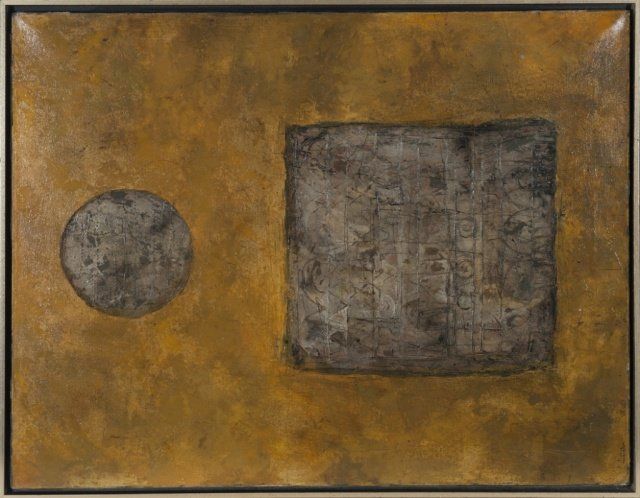 Jacquemon, Pierre (NY/Fr., 1936-2002). Geometric textured composition. Oil on canvas. Signed at l.l., "Pierre Jacquemon". Simple wood frame. 27 3/4" x 22". Frame: 29 1/4" x 23 1/4".