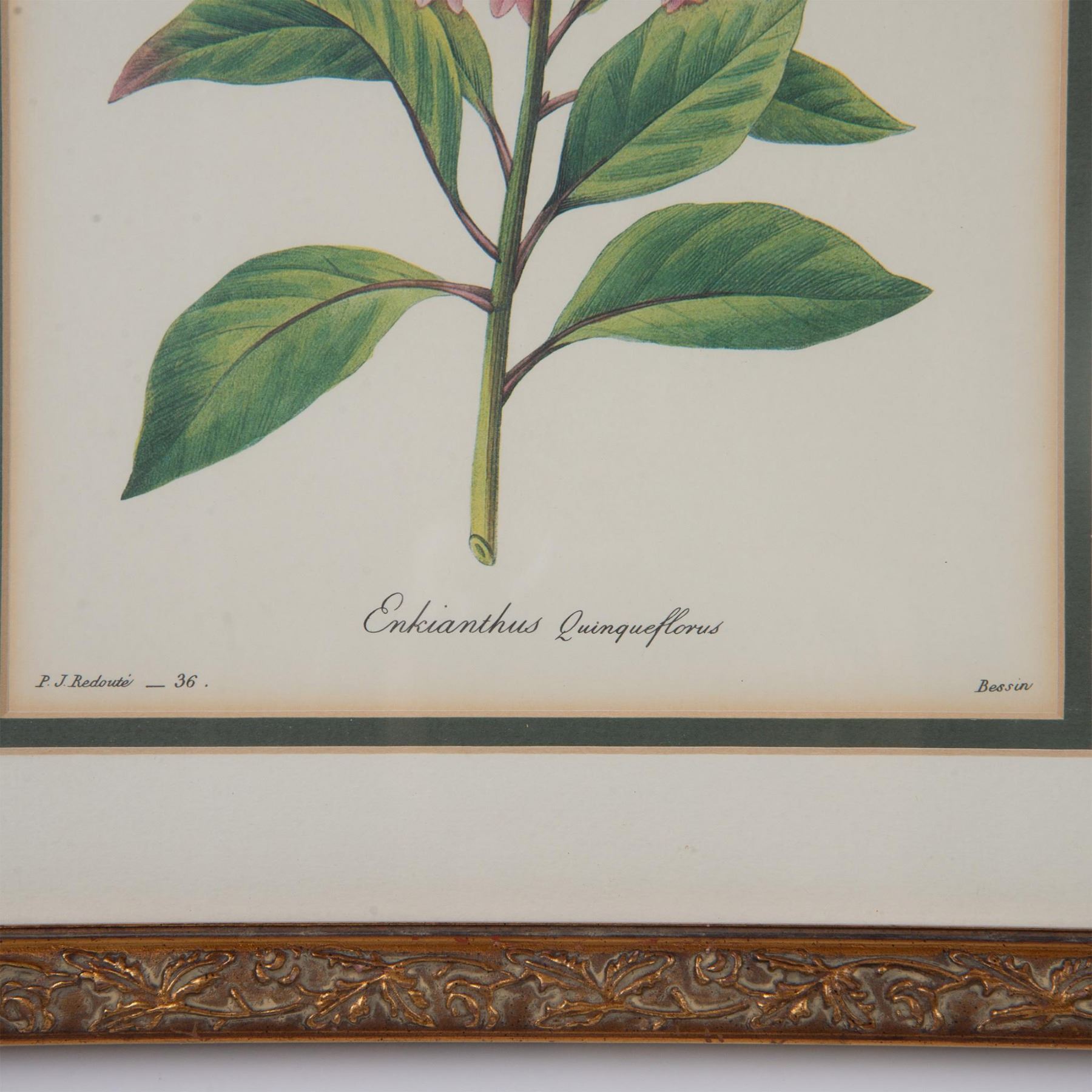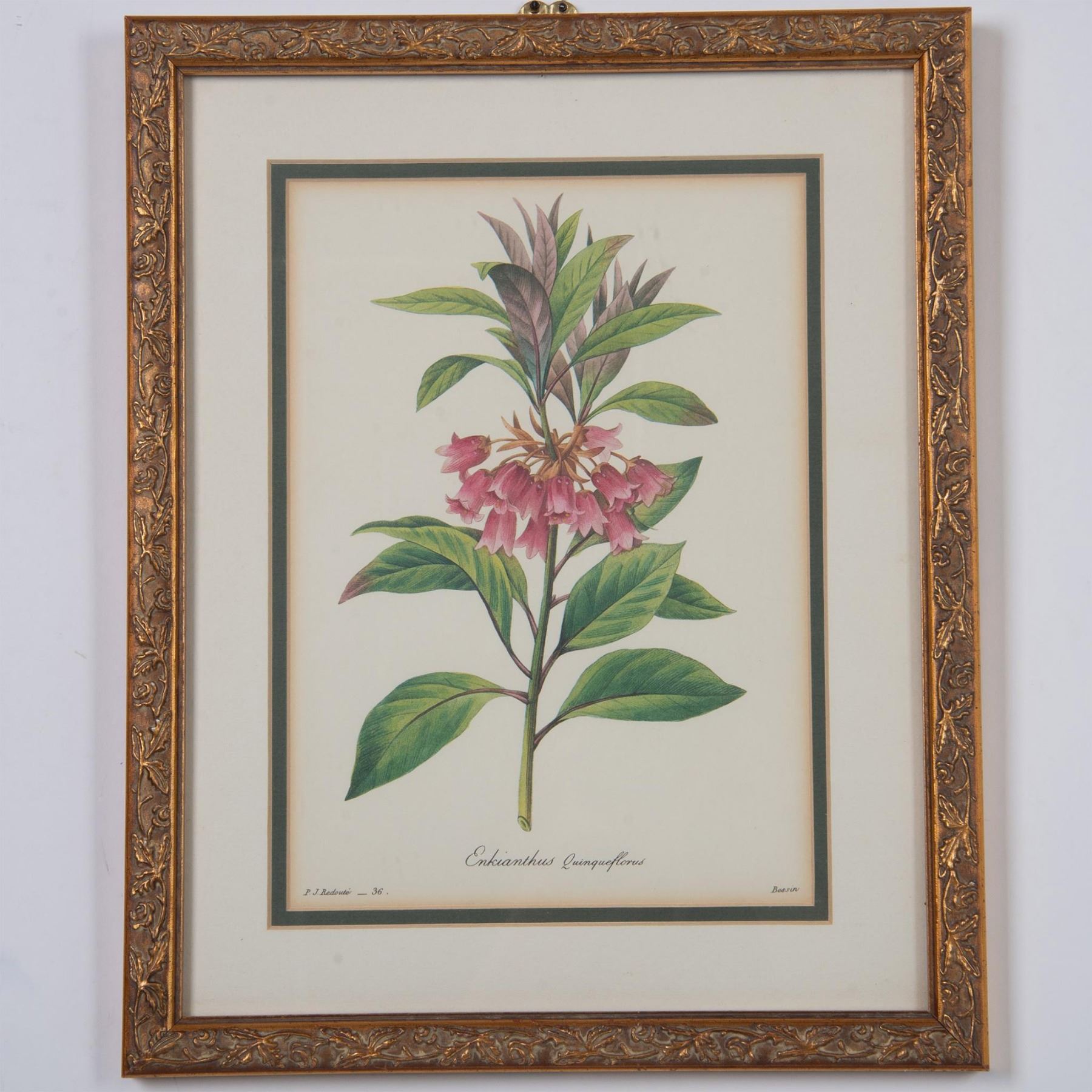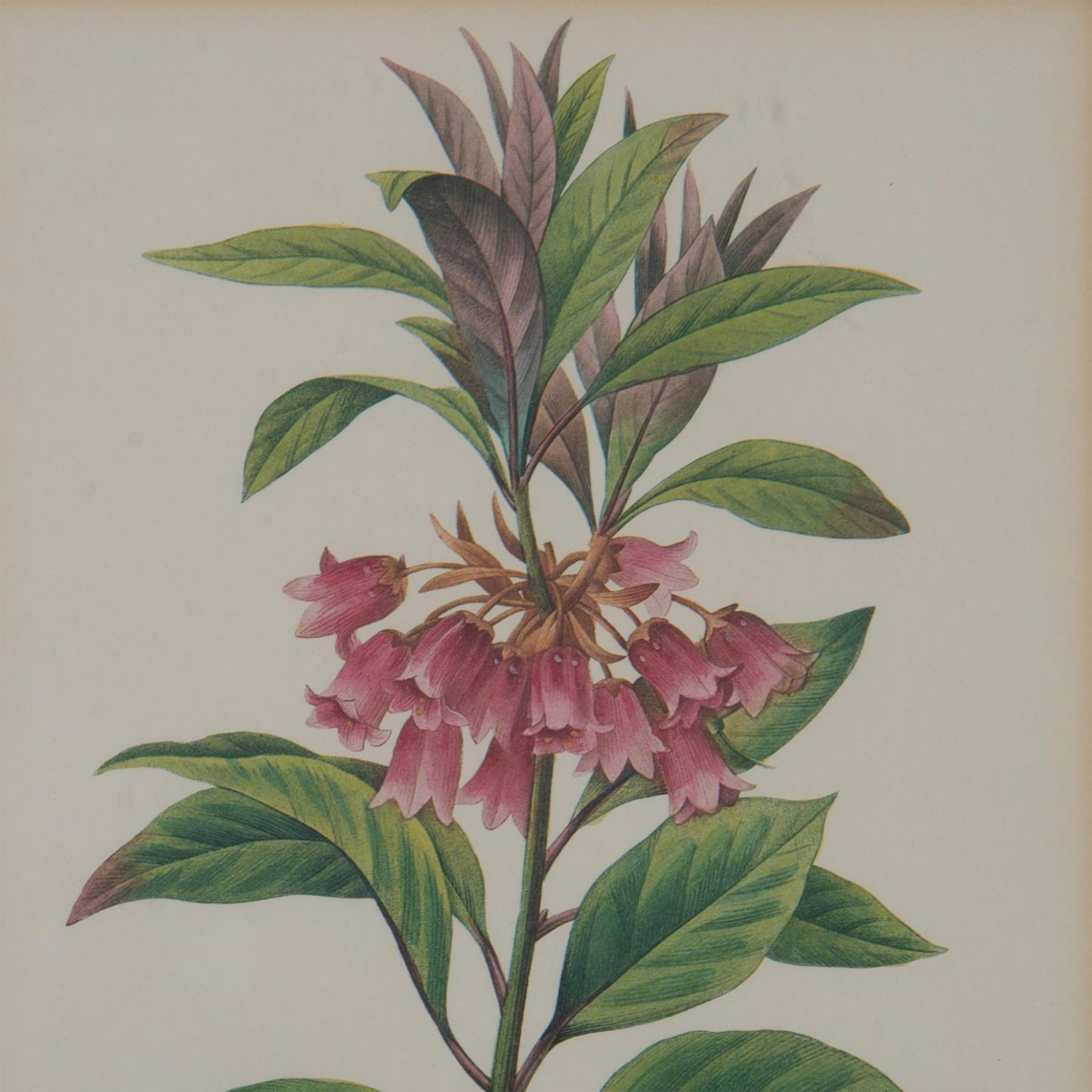 A lovely color lithograph print on paper after an engraving by Bessin, based on an original botanical painting by Pierre Joseph Redoute, depicting the Chinese new year flower. Housed in a gilded frame with a leaf-like pattern, with a white mat with a green border. Artwork can be unframed and rolled for shipment.