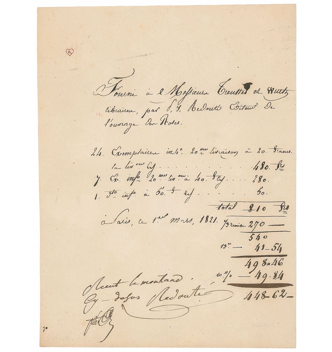 Painter and botanist from the Southern Netherlands (1759–1840), known for his watercolors of roses, lilies, and other flowers at Malmaison. Manuscript DS in French, signed “Redoute,” with four additional words in his hand, one page, 7 x 9.25, March 1, 1821. A detailed receipt for several copies of his famous works on “Roses” on consignment with the prominent imperial bookstore Treutel & Wurtz. In fine condition.
