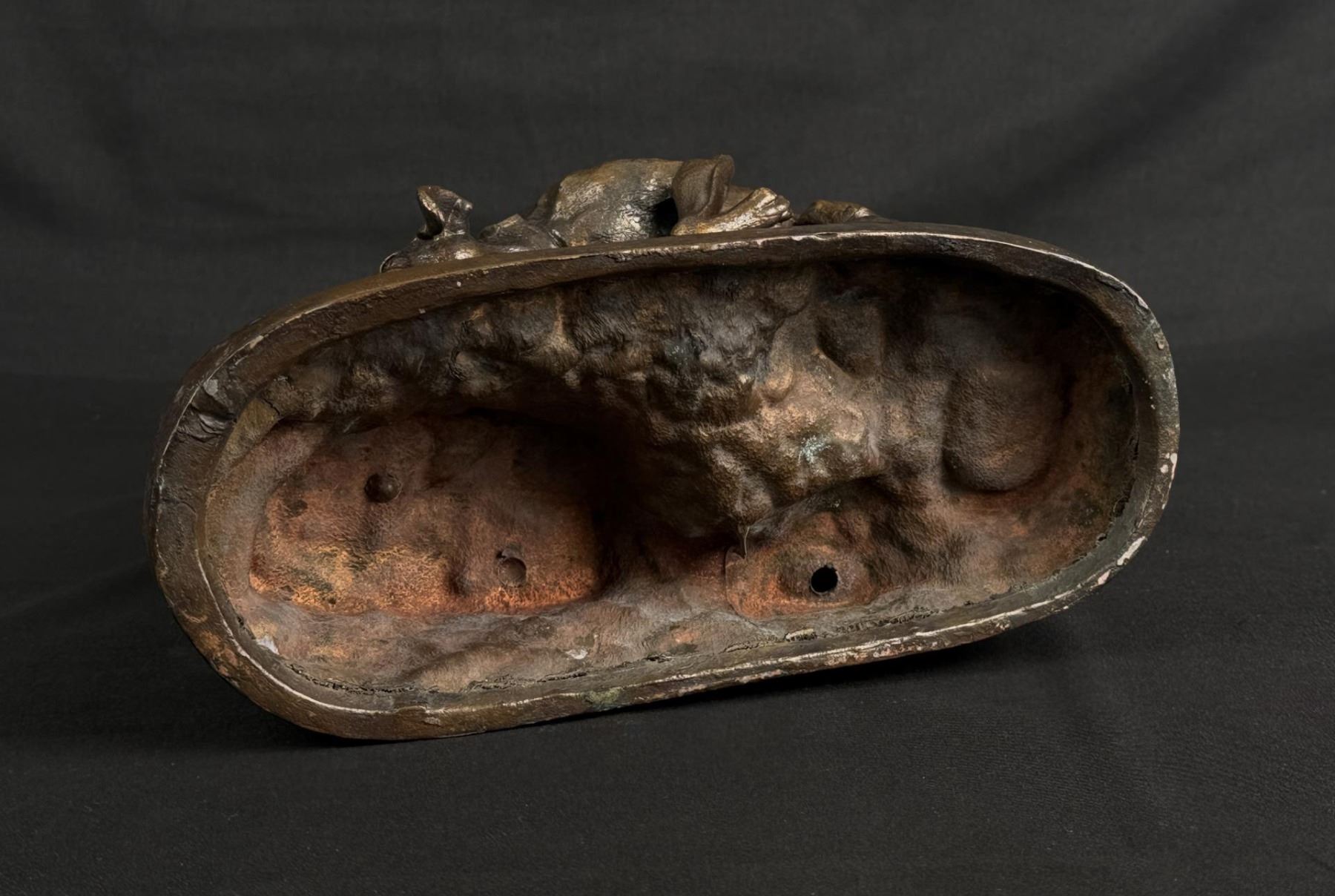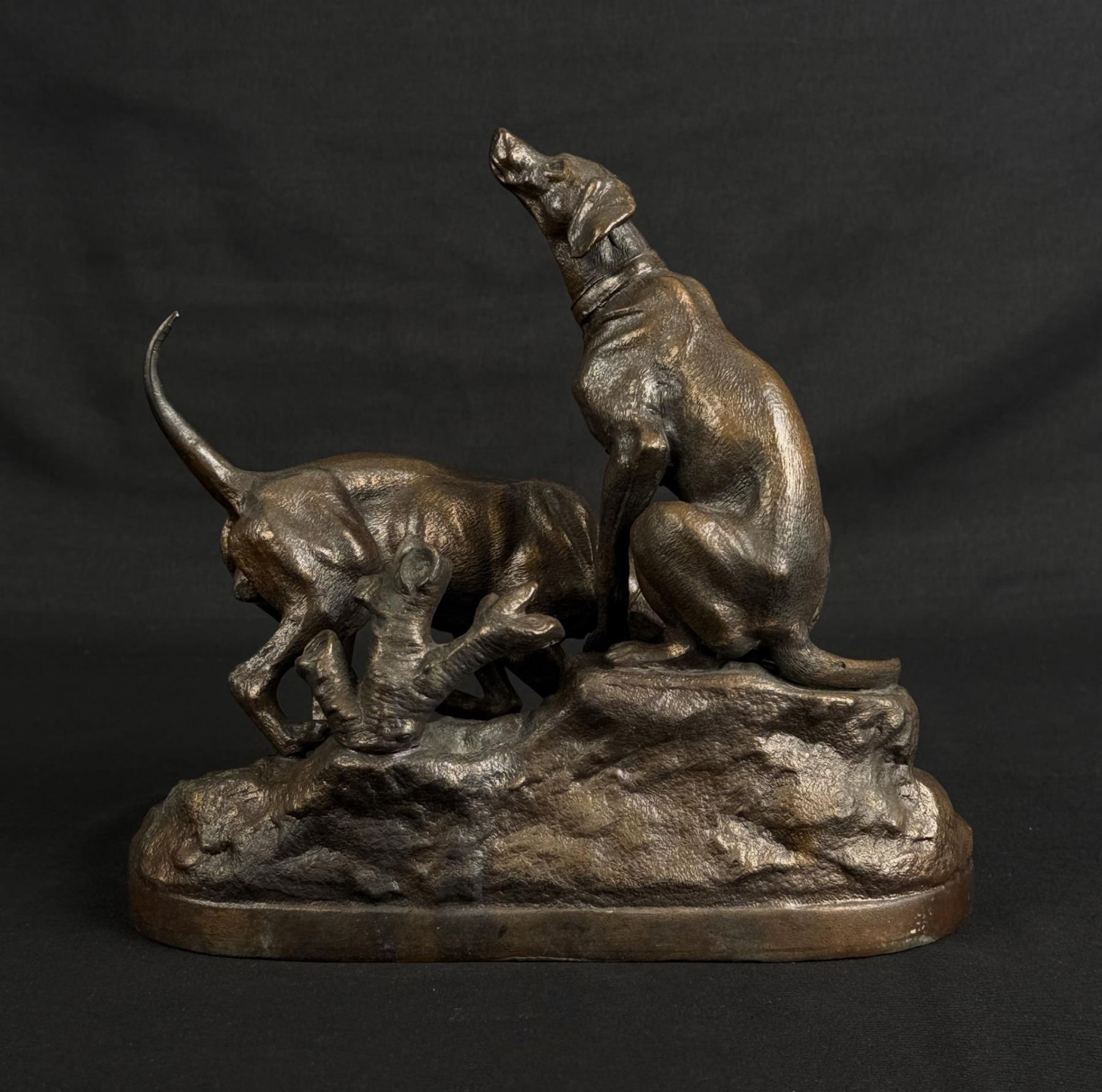 Title is Hunting Dogs. 9 1/2" by 8 5/8" by 4 3/4". Pierre Jules (P.J.) Mene (1810 - 1879) was active/lived in France. Pierre Jules Mene is known for Realistic animal sculpture, dogs, horses, wildlife. Pierre Jules Mene, (P. J. Mene), was born in Paris in March of 1810 and died in Paris at number 9 Rue de L'Entrepot on May 21, 1879. The son of a metal turner, he received his earliest teaching on sculpture and foundry work from his father, and he opened his own foundry in the 1850s, creating lost-wax castings of his sculptures in bronze. Although mostly self-taught, Mene was encouraged by sculptor Rene Compaire, and was also influenced by two painters: Edwin Landseer of England with his expressive sentimentality, as well as Carle Vernet of France, in capturing spirit, grace and compositional beauty in sculptural form. Much of Mene's early studies were made at the "Jardin des Plantes" in Paris, where he developed great talent for animal sculpture. He first exhibited the bronze statuette entitled Dog and Fox at the Paris Salon in 1838, and from that time exhibited regularly until his death. He received four awards from the Paris Salon: Second Class in 1848, First Class in 1852 and 1861, and a Third Class award in 1855. Mene did not sculpt statues, but rather bronze statuettes generally of domestic and farm animals at rest, (horses, dogs, cows, bulls, sheep and goats). He modeled over 150 subjects, and received the "Cross of the Legion of Honor" in 1861. He exhibited in England at the Great Expositions of 1855, 1867 and 1878, where he was praised as the "Landseer" of sculpture. P. J. Mene was one of the most prolific and popular sculptors of the Animalier School, as well as one of it's earliest pioneers. His sculptures were widely collected by the public. His only sculpture acquired by the State of France during his lifetime was the bronze Mounted Huntsman and His Hounds. Charming and charismatic, Mene was accepted socially within the various French artistic communities. Mene's earliest works, (such as Tiger and Alligator), reflected Antoine-Louis Barye's influence, but in contrast with the romantic style of Barye, Mene's style evolved in a contrasting way. He excelled in realistic portrayals of animals, sculpting each in their natural habitat, capturing fleeting movements and delicate details. Generally, his sculptures were portraits with a hint of human personality. Mene was praised for his "perfection in modeling the figures of animals, and for the truth and beauty of his representations." He worked in the Juste Milieu, blending romantic and naturalist elements while retaining a degree of traditionalism. Mene's casts were of the highest quality and patinas. The last cast of an addition was edited as sharply as the first, and he was meticulous in the after work of his bronze casts, chiseling extremely fine details. His bronzes were signed in block letters "P. J. Mene" with no foundry marks. He taught his son-in-law, Auguste Cain, who continued Mene's foundries from 1879 to 1892. Subsequently, Mene's models were sold to the Susse Freres Foundry which cast well into the 20th century. Many recasts have been produced.