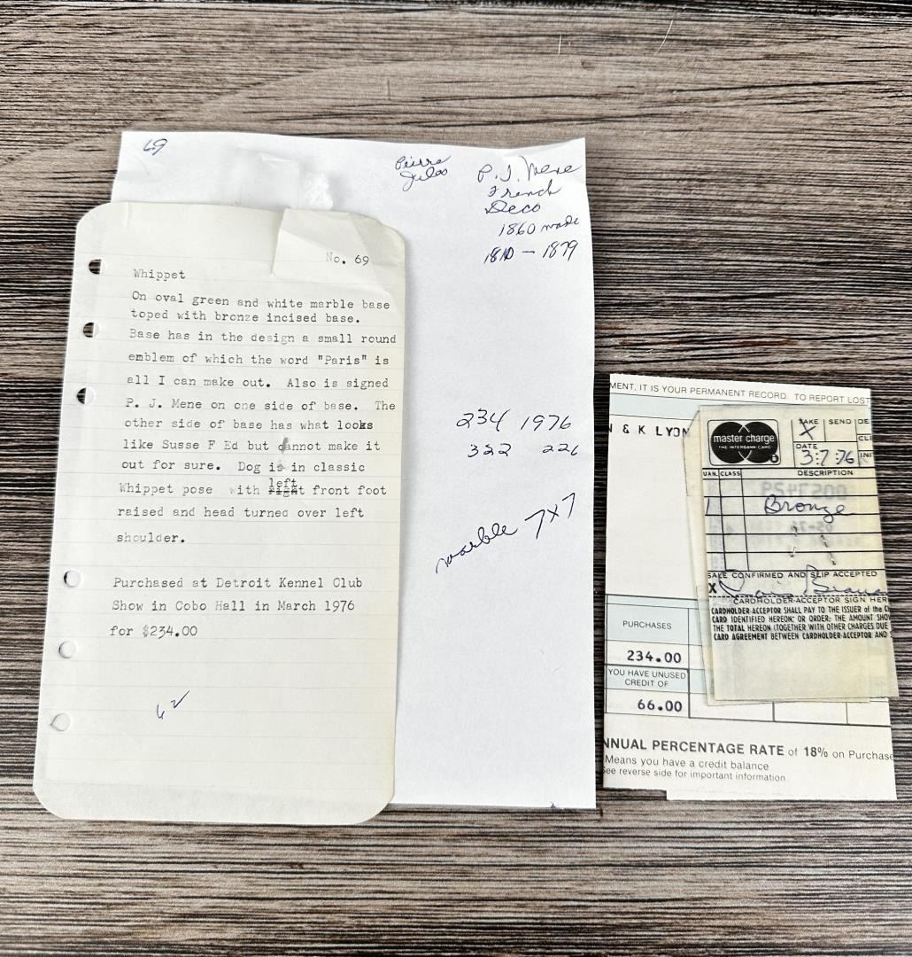 7 1/4" by 6 3/4" by 4 3/4". Title is Whippet Gigi. Purchased at Detroit Kennel Club 1976. Pierre Jules (P.J.) Mene (1810 - 1879) was active/lived in France. Pierre Jules Mene is known for Realistic animal sculpture, dogs, horses, wildlife. Pierre Jules Mene, (P. J. Mene), was born in Paris in March of 1810 and died in Paris at number 9 Rue de L'Entrepot on May 21, 1879. The son of a metal turner, he received his earliest teaching on sculpture and foundry work from his father, and he opened his own foundry in the 1850s, creating lost-wax castings of his sculptures in bronze. Although mostly self-taught, Mene was encouraged by sculptor Rene Compaire, and was also influenced by two painters: Edwin Landseer of England with his expressive sentimentality, as well as Carle Vernet of France, in capturing spirit, grace and compositional beauty in sculptural form. Much of Mene's early studies were made at the "Jardin des Plantes" in Paris, where he developed great talent for animal sculpture. He first exhibited the bronze statuette entitled Dog and Fox at the Paris Salon in 1838, and from that time exhibited regularly until his death. He received four awards from the Paris Salon: Second Class in 1848, First Class in 1852 and 1861, and a Third Class award in 1855. Mene did not sculpt statues, but rather bronze statuettes generally of domestic and farm animals at rest, (horses, dogs, cows, bulls, sheep and goats). He modeled over 150 subjects, and received the "Cross of the Legion of Honor" in 1861. He exhibited in England at the Great Expositions of 1855, 1867 and 1878, where he was praised as the "Landseer" of sculpture. P. J. Mene was one of the most prolific and popular sculptors of the Animalier School, as well as one of it's earliest pioneers. His sculptures were widely collected by the public. His only sculpture acquired by the State of France during his lifetime was the bronze Mounted Huntsman and His Hounds. Charming and charismatic, Mene was accepted socially within the various French artistic communities. Mene's earliest works, (such as Tiger and Alligator), reflected Antoine-Louis Barye's influence, but in contrast with the romantic style of Barye, Mene's style evolved in a contrasting way. He excelled in realistic portrayals of animals, sculpting each in their natural habitat, capturing fleeting movements and delicate details. Generally, his sculptures were portraits with a hint of human personality. Mene was praised for his "perfection in modeling the figures of animals, and for the truth and beauty of his representations." He worked in the Juste Milieu, blending romantic and naturalist elements while retaining a degree of traditionalism. Mene's casts were of the highest quality and patinas. The last cast of an addition was edited as sharply as the first, and he was meticulous in the after work of his bronze casts, chiseling extremely fine details. His bronzes were signed in block letters "P. J. Mene" with no foundry marks. He taught his son-in-law, Auguste Cain, who continued Mene's foundries from 1879 to 1892. Subsequently, Mene's models were sold to the Susse Freres Foundry which cast well into the 20th century. Many recasts have been produced.
