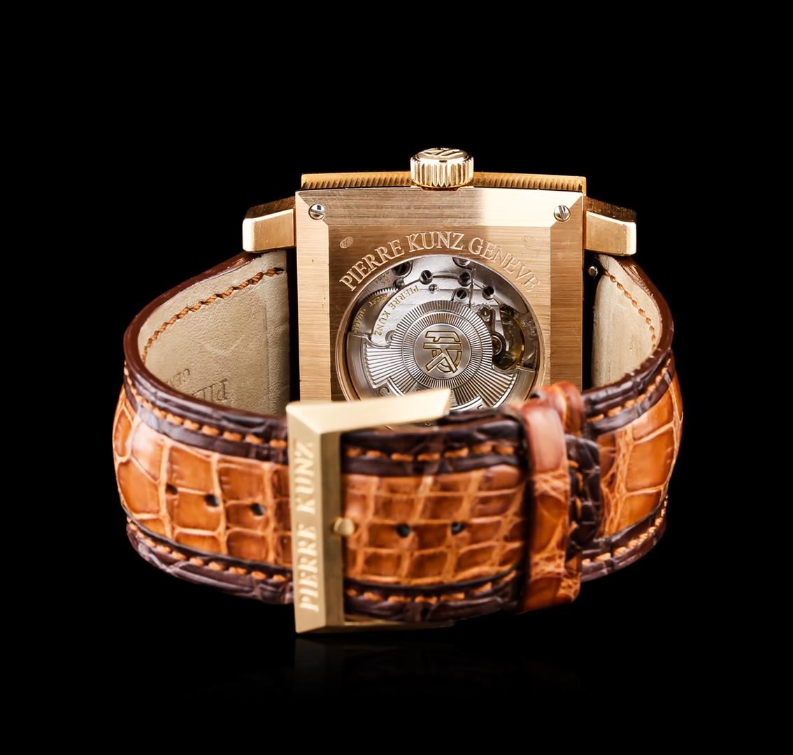 One, Pierre Kunz Seconde Virevoltante Retrograde wristwatch electronically tested 18KT rose gold, Case: 49 x 43mm, Case Sides: vertical raised tapestry pattern, Synthetic Sapphire Exhibition Case Back: engraved with the manufacturers name, ID numbers and the Swiss Hallmark, Fixed Bezel: 18KT rose gold brushed finish, Crystal: synthetic sapphire, Movement: automatic. Power Reserve: 42 hours. Dial: Bronze Sunburst, with separate square dials for Hours, and Minutes, Second Hand Sub Dial: 6 o'clock position, Pierre Kunz Bracelet: saddle stitched alligator strap with an 18KT rose gold signed buckle clasp, Condition: G-7 Near Mint. Eight inch length, adjustable. Weight of Watch150.26 grams. AIG Appraised at $26,000.00.