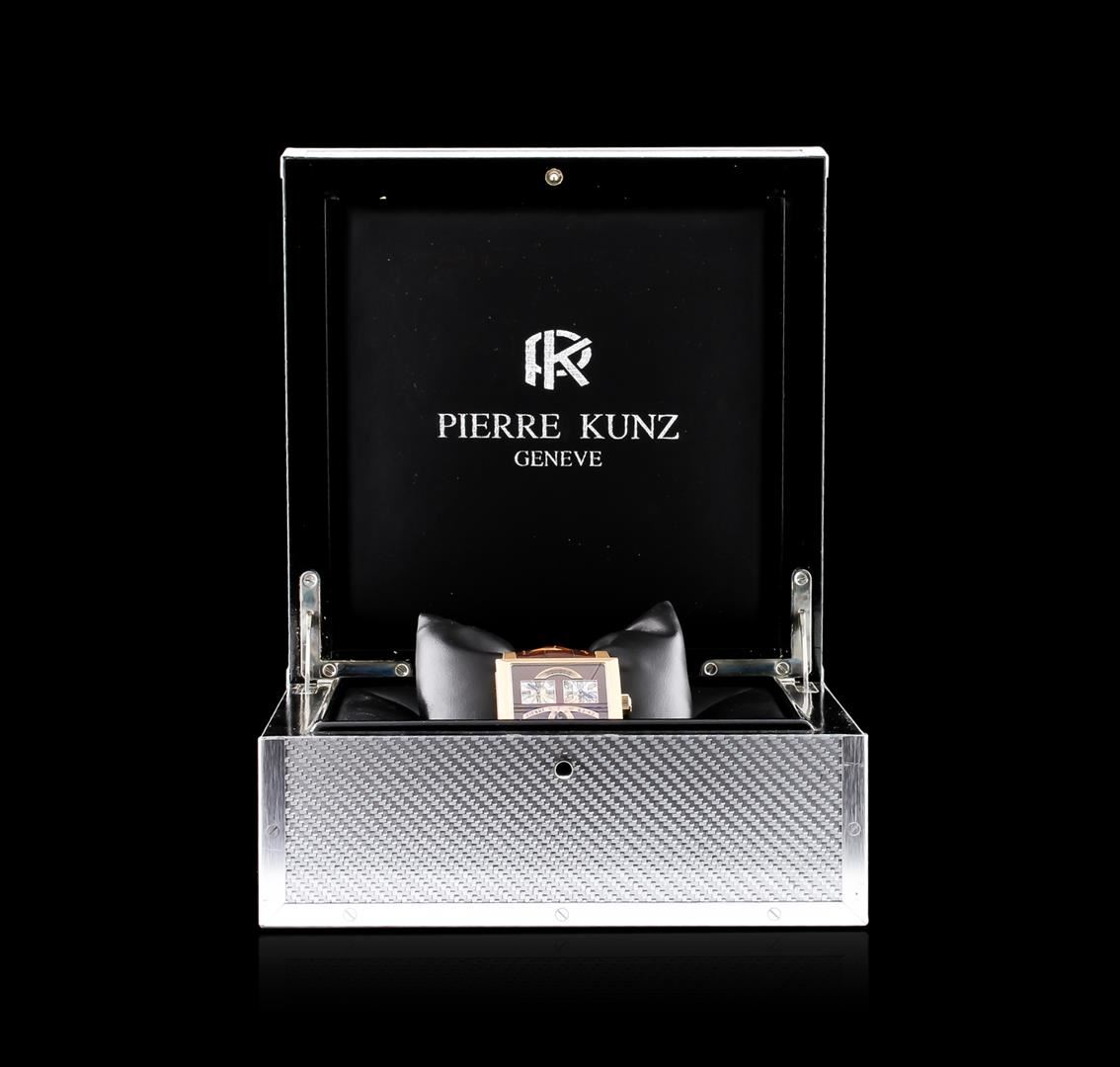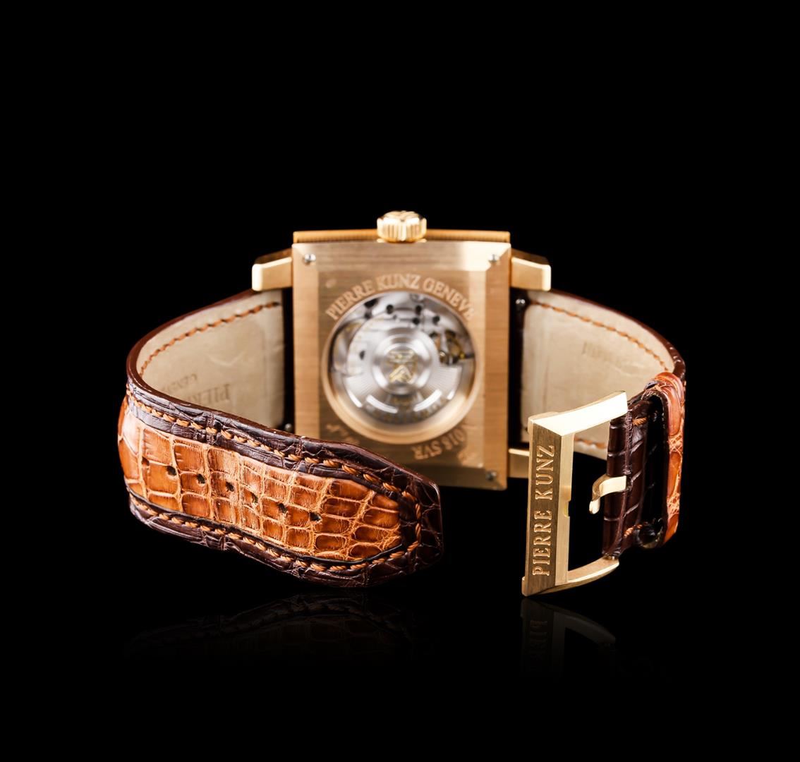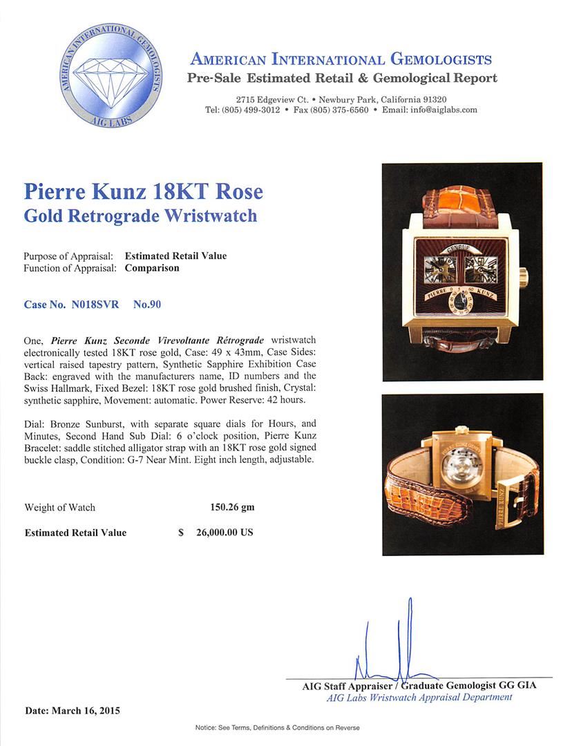 One, Pierre Kunz Seconde Virevoltante Retrograde wristwatch electronically tested 18KT rose gold, Case: 49 x 43mm, Case Sides: vertical raised tapestry pattern, Synthetic Sapphire Exhibition Case Back: engraved with the manufacturers name, ID numbers and the Swiss Hallmark, Fixed Bezel: 18KT rose gold brushed finish, Crystal: synthetic sapphire, Movement: automatic. Power Reserve: 42 hours. Dial: Bronze Sunburst, with separate square dials for Hours, and Minutes, Second Hand Sub Dial: 6 o'clock position, Pierre Kunz Bracelet: saddle stitched alligator strap with an 18KT rose gold signed buckle clasp, Condition: G-7 Near Mint. Eight inch length, adjustable. Weight of Watch150.26 grams. AIG Appraised at $26,000.00.