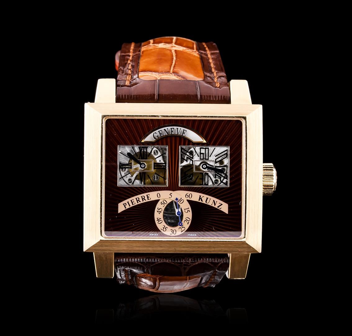 One, Pierre Kunz Seconde Virevoltante Retrograde wristwatch electronically tested 18KT rose gold, Case: 49 x 43mm, Case Sides: vertical raised tapestry pattern, Synthetic Sapphire Exhibition Case Back: engraved with the manufacturers name, ID numbers and the Swiss Hallmark, Fixed Bezel: 18KT rose gold brushed finish, Crystal: synthetic sapphire, Movement: automatic. Power Reserve: 42 hours. Dial: Bronze Sunburst, with separate square dials for Hours, and Minutes, Second Hand Sub Dial: 6 o'clock position, Pierre Kunz Bracelet: saddle stitched alligator strap with an 18KT rose gold signed buckle clasp, Condition: G-7 Near Mint. Eight inch length, adjustable. Weight of Watch150.26 grams. AIG Appraised at $26,000.00.