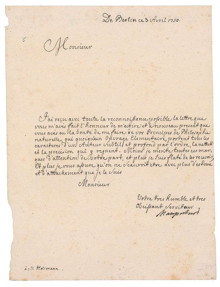 French mathematician and philosopher (1698–1759). LS in French, signed “Maupertuis,” one page, 6 x 8, April 3, 1750. Letter to philosopher and scientist Samuel Christian Hollmann. In part (translated): “…all possible gratitude for the gracious gift of your Principles of Natural Philosophy. Although it’s a basic work it bears all the characteristics of a subtle and profound author because of the order, clarity, and precision which prevail in it.” In fine condition, with paper loss to left edge and scattered mild foxing.