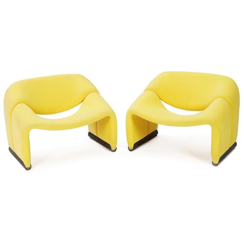 Pierre Paulin chairs, pair, original yellow upholstery over a bent steel frame with black enamel metal bases, zippered covers, 33" x 25" x 24.5", very good condition