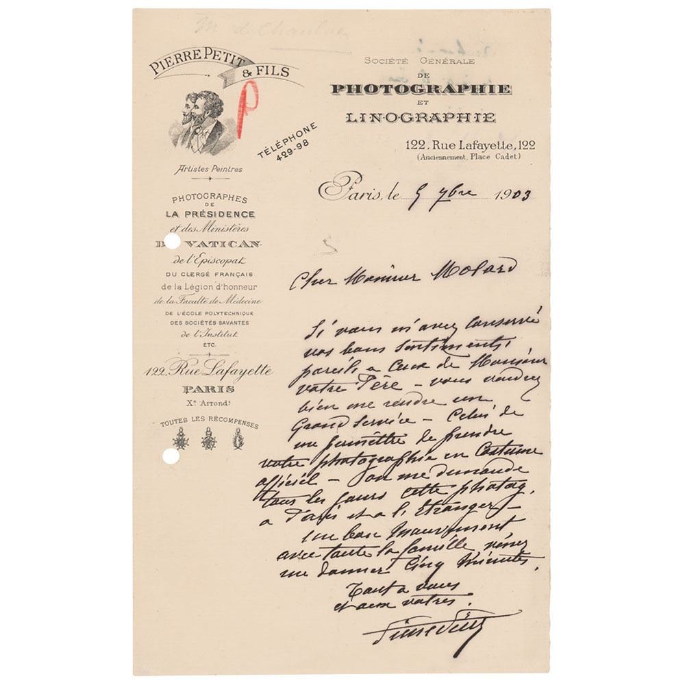 ALS in French, one page, 5.25 x 8.5, illustrated Pierre Petit & Fils Photographie et Linographie letterhead, July 9, 1903. An untranslated handwritten letter to "Cher Monsieur Molard." In fine condition, with two file holes to the left edge.