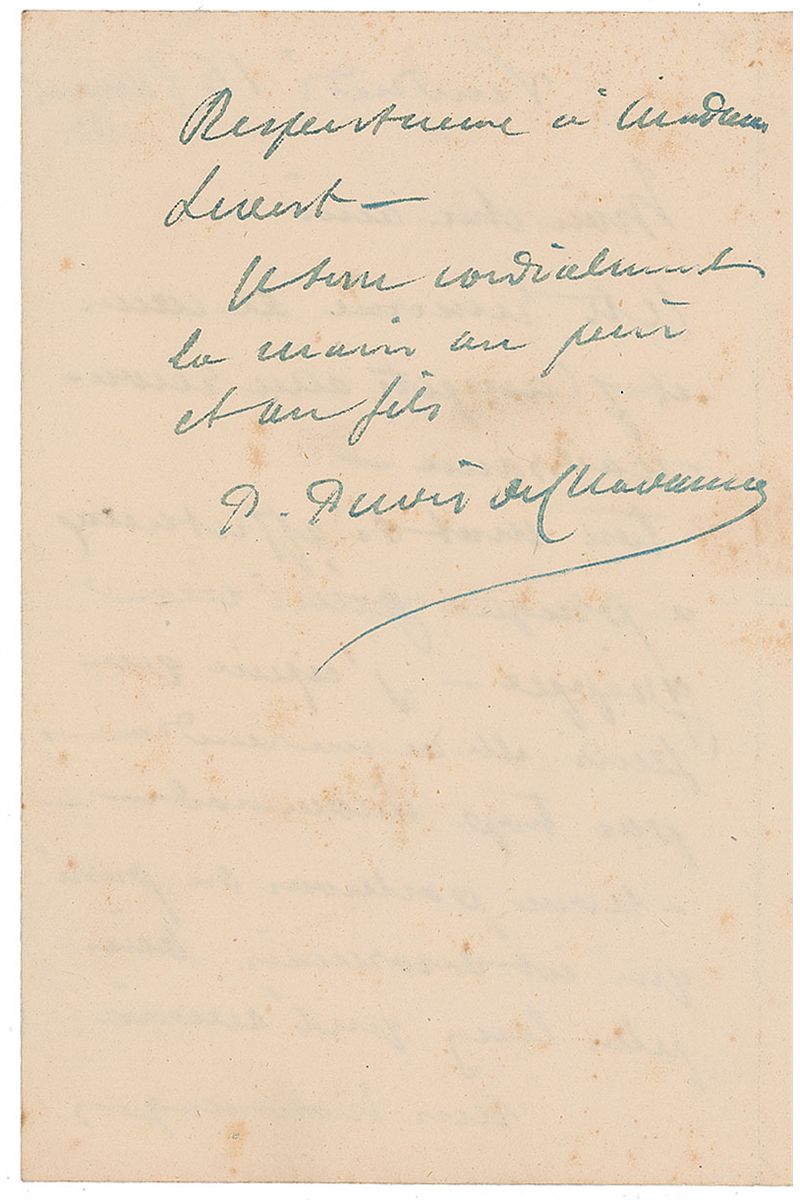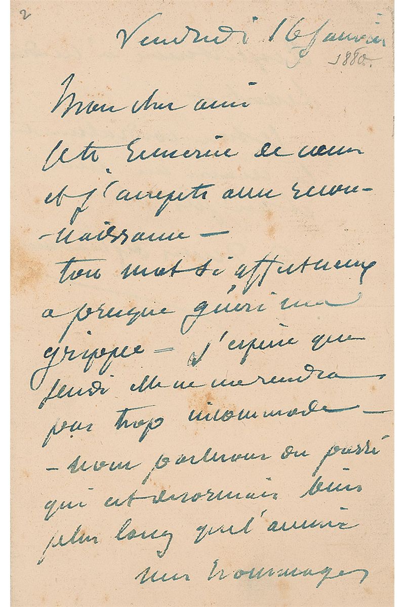 French painter (1824–1898) who became the president and co-founder of the Société Nationale des Beaux-Arts. ALS in French, signed “P. Puvis de Chavannes,” one page both sides, 4.25 x 7, January 16, [1880]. Untranslated letter to a friend. In very good condition, with scattered light toning and foxing, several pencil notations, and conclusion of text and signature a shade or two light due to decreased ink flow.