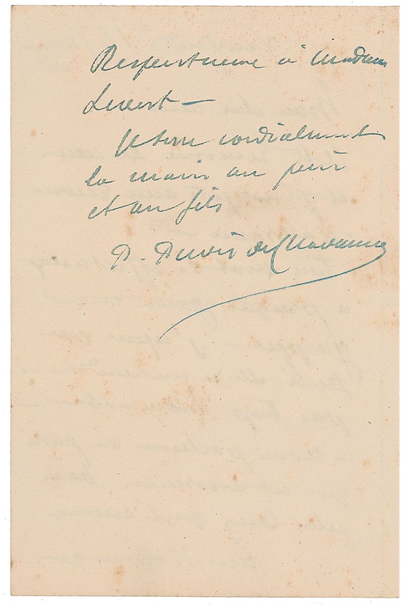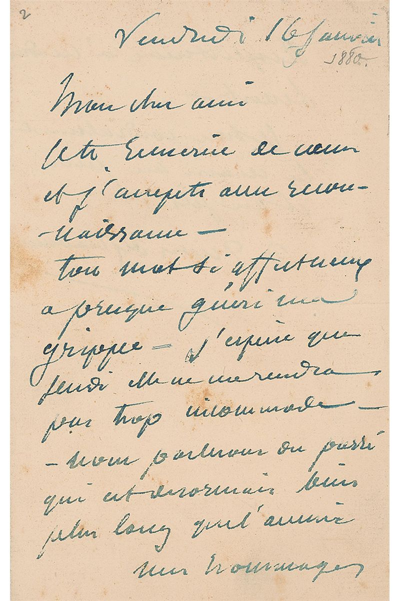French painter (1824–1898) who became the president and co-founder of the Société Nationale des Beaux-Arts. ALS in French, signed “P. Puvis de Chavannes,” one page both sides, 4.25 x 7, January 16, [1880]. Untranslated letter to a friend. In very good condition, with scattered light toning and foxing, several pencil notations, and conclusion of text and signature a shade or two light due to decreased ink flow.
