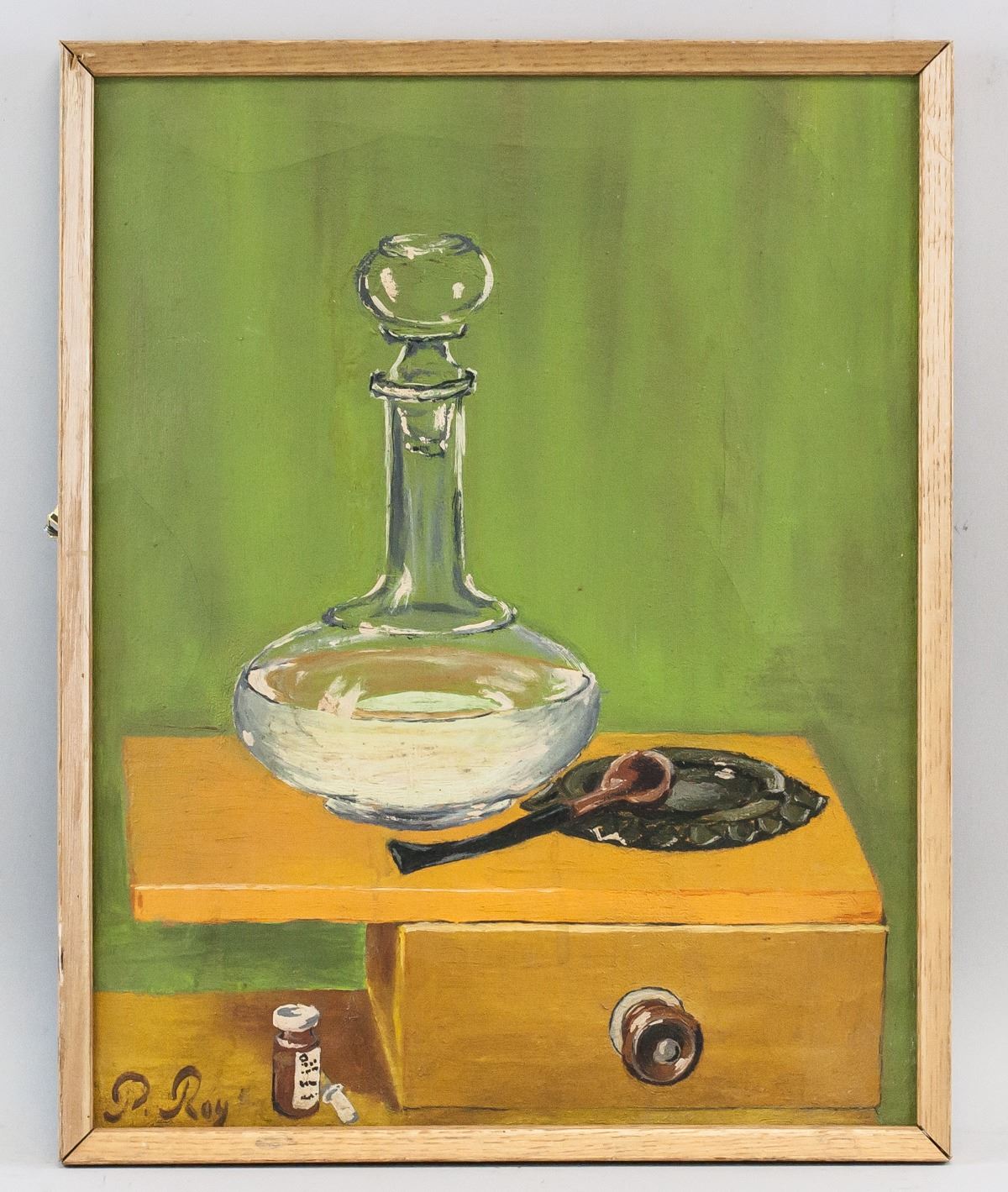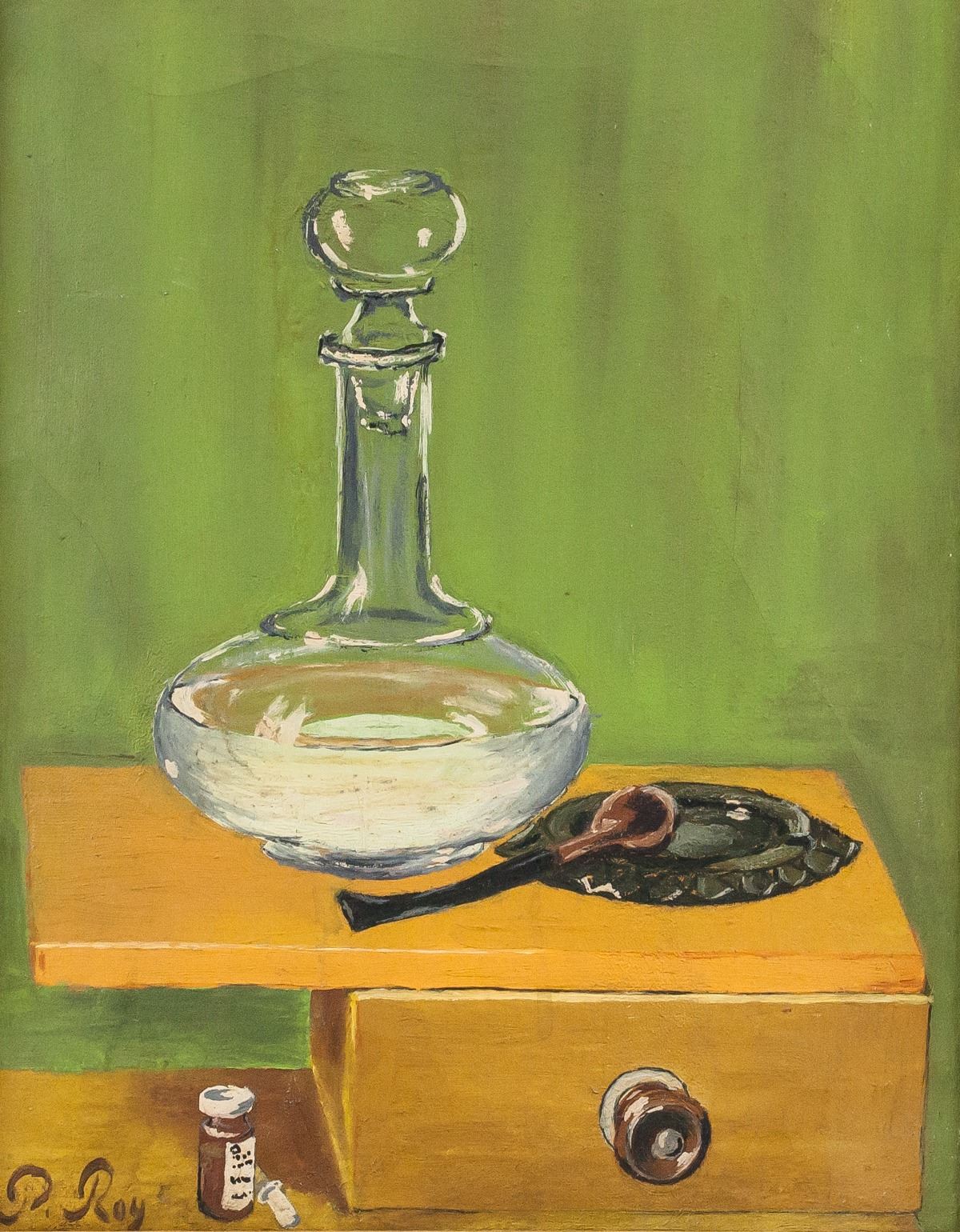 Oil on canvas, framed. Featuring a still life of a glass vase with stopper and pipe atop tray. Signed P. Roy on the lower left corner. Attributed to Pierre Roy (1880-1950, French). 42 x 33 cm (16.5 x 13 inches). Provenance: This lot carries limited provenance from a Southern Ontario estate