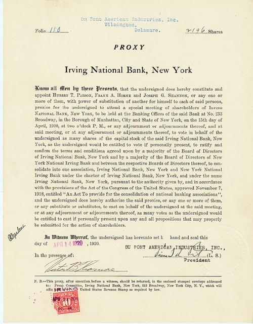 PIERRE S. DUPONT. 1920, New York. An "Irving National Bank" proxy document signed by "Pierre S Du Pont" as president of "Du Pont American Industries, Inc." He appointed three men to vote for him at the shareholders meeting. The document is in choice condition overall.