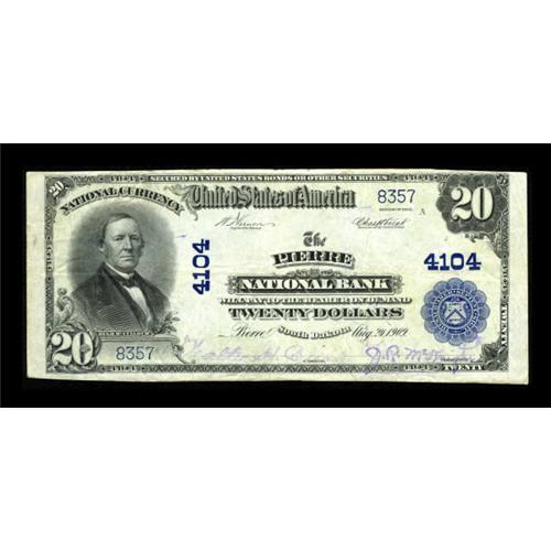 <B>Pierre, SD</B></I> - $20 1902 Plain Back Fr. 652 <B>The Pierre NB</B></I> Ch. # 4104<BR> A considerably above average note from this elusive state capital. Nice <B>Very Fine,</B></I> with bright paper and sharp purple signatures. <BR><BR><b>Shipping:</b> Coins & Currency (<a target="_blank" href="http://www.heritageauctions.com/common/shipping.php">view shipping information</a>)