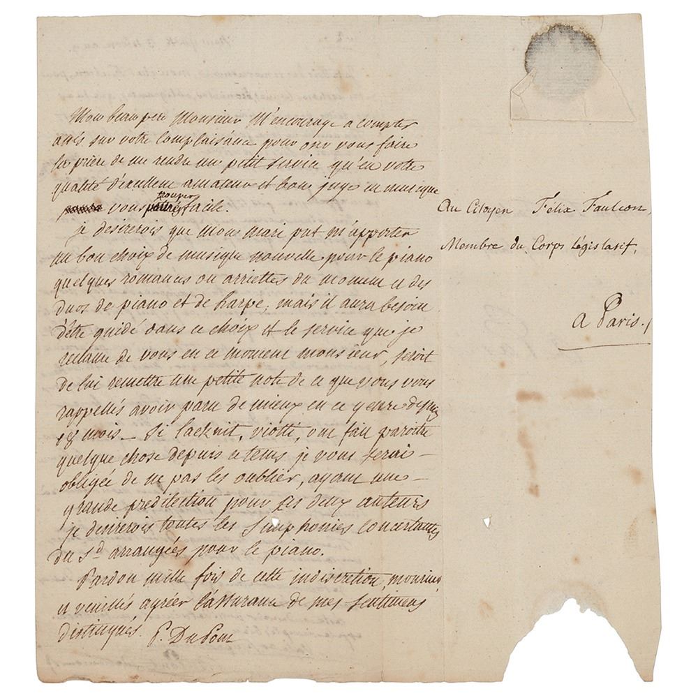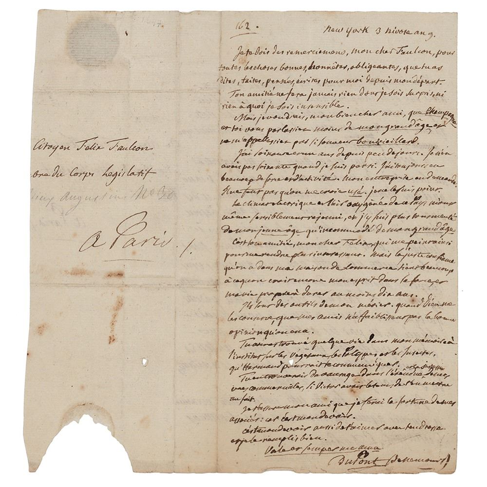 ALS in French, signed “du Pont de Nemours,†one page, 5 x 8, December 24, 1800. Handwritten letter to old Parisian friend Felix Faulcon, in part (translated): “You are entitled, my dear Faulcon, to many thanks…Your friendship will never do anything that will surprise me…Nevertheless, I would appreciate, dear friend, if…you would talk less about my advancing years and would not so often refer to me as that nice old gentleman. I turned sixty-one only a few days ago. I was not even sixty when I left. I was always blessed with an energetic and active nature. It is a prerequisite of my type of business. Others may think of me as being old and tired. I am not. This country’s dry climate and oxygenated air have even rejuvenated me to make me more interesting. But the well-placed trust that others have in my firm relies heavily on the fact that they believe me to be of clear mind and with a life expectancy of at least ten years. These are the tools of my trade. When God sees fit to bless me with them, let my friends not weaken the perception others have of them…You can be assured, dear friend, that I will bring prosperity to my associates because that is my duty.†In very good to fine condition, with much of the integral address leaf trimmed off.