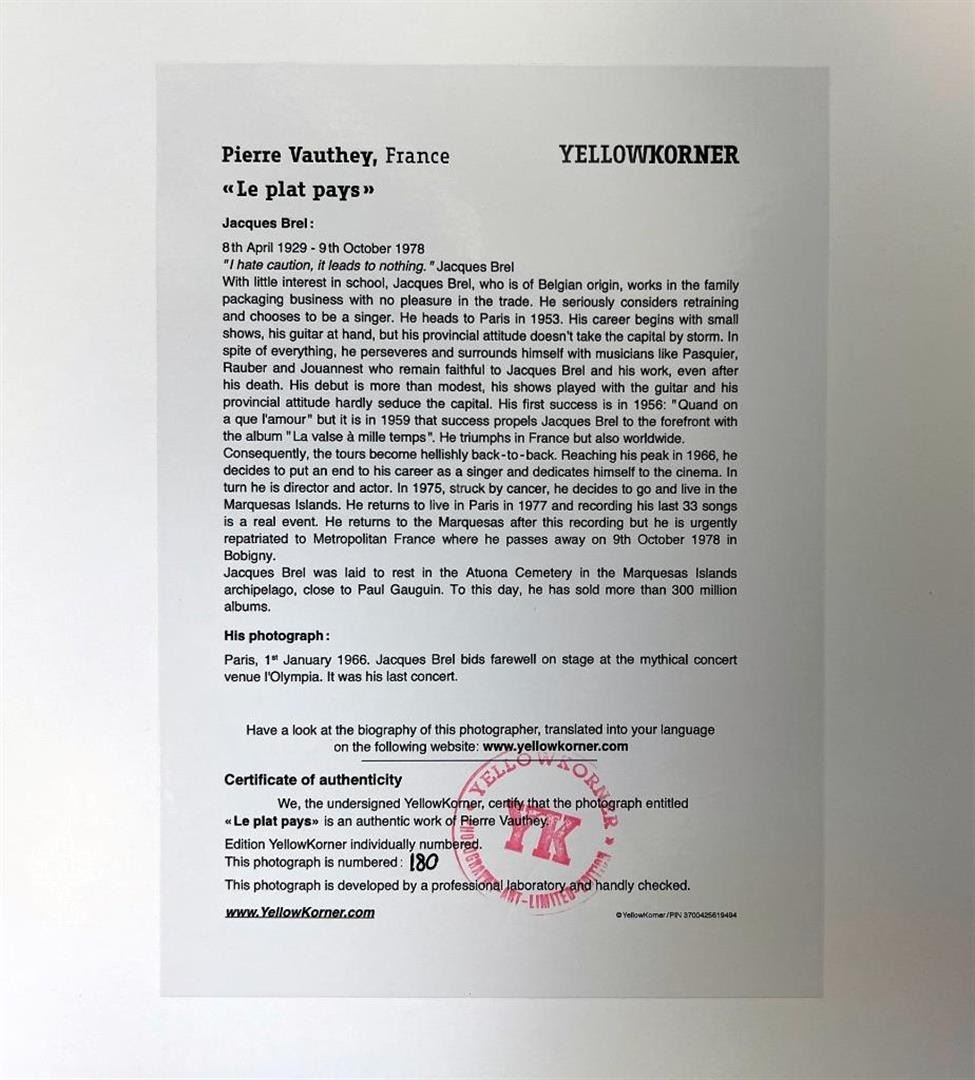 Pierre Vauthey Jacques Brel France Le Play Pays YellowKorner Certified Photograph. Certificate of Authenticity from YellowKorner affixed to the back. Matted Dimensions 16"x20". Protected with Clear Mylar Sleeve.