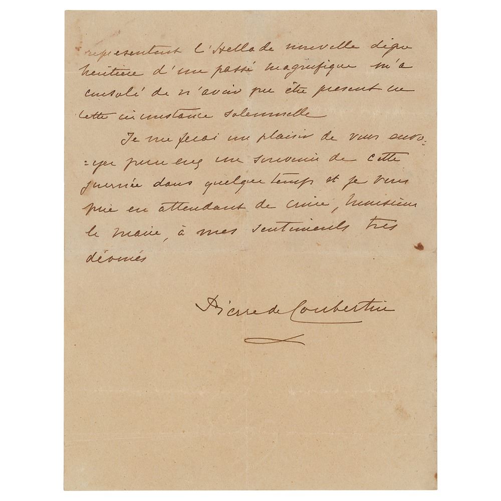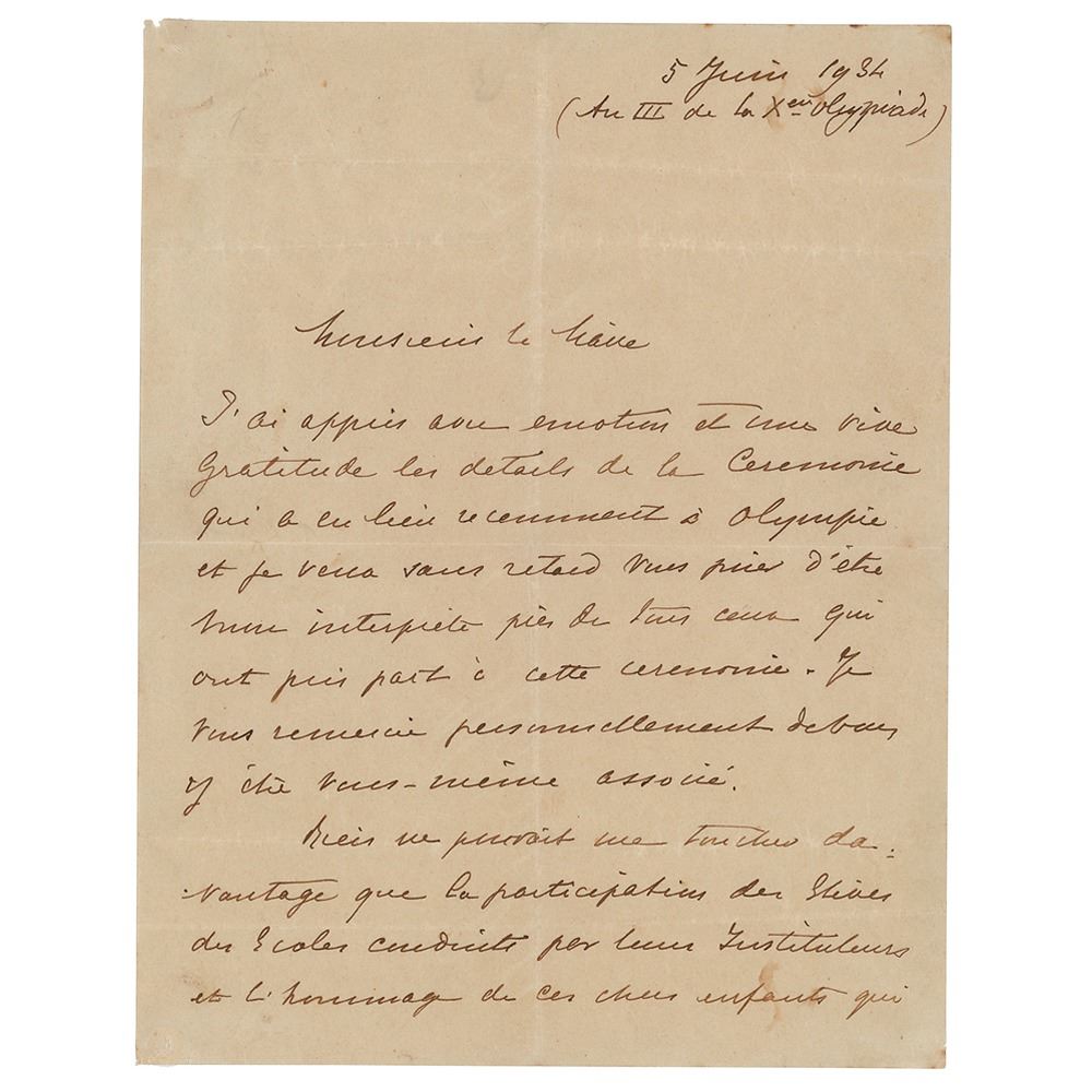 ALS in French, two pages, 8.25 x 10.5, June 5, 1934. Handwritten letter to "Mr. Mayor," ostensibly the mayor of the ancient Arcadian village Tegea, in part (translated): “With great emotion and the most genuine feeling of gratitude I learned of the details of the Ceremony that recently took place in Olympia, and wish, even if belatedly, to kindly ask you to be my interpreter in front of all those who took part in this ceremony. I want to personally thank you for your contribution to this. Nothing could touch me most than the participation of the School pupils, under the guidance of their masters, and the tribute paid by these lovely children who represent the new Greece, which inherited a glorious past, and all this comforts me for not being able to attend this official ceremony. It is my pleasure to send you…in a short while, something to remind you of that day, and until then, dear Mr. Mayor, please accept the assurance of my deepest respect.†Under the date at the top, Coubertin has added in parentheses: “To the III of the X Olympiad.†In fine condition, with adhesive remnants to reverse left corners of first page.