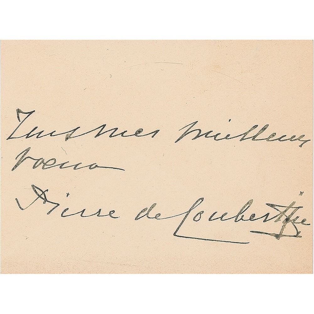 Rare vintage fountain pen signature, "Pierre de Coubertin,†who adds an untranslated sentiment above, on an off-white 3.75 x 2.75 card. In very fine condition.