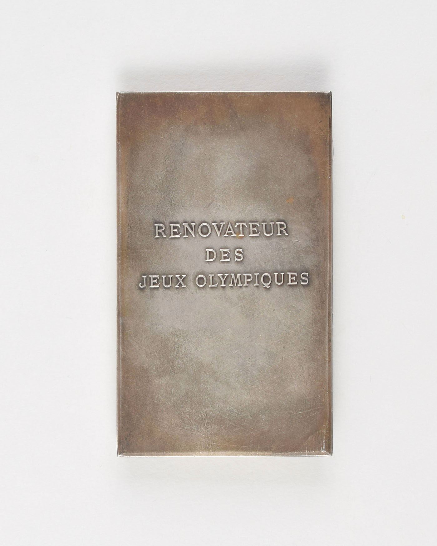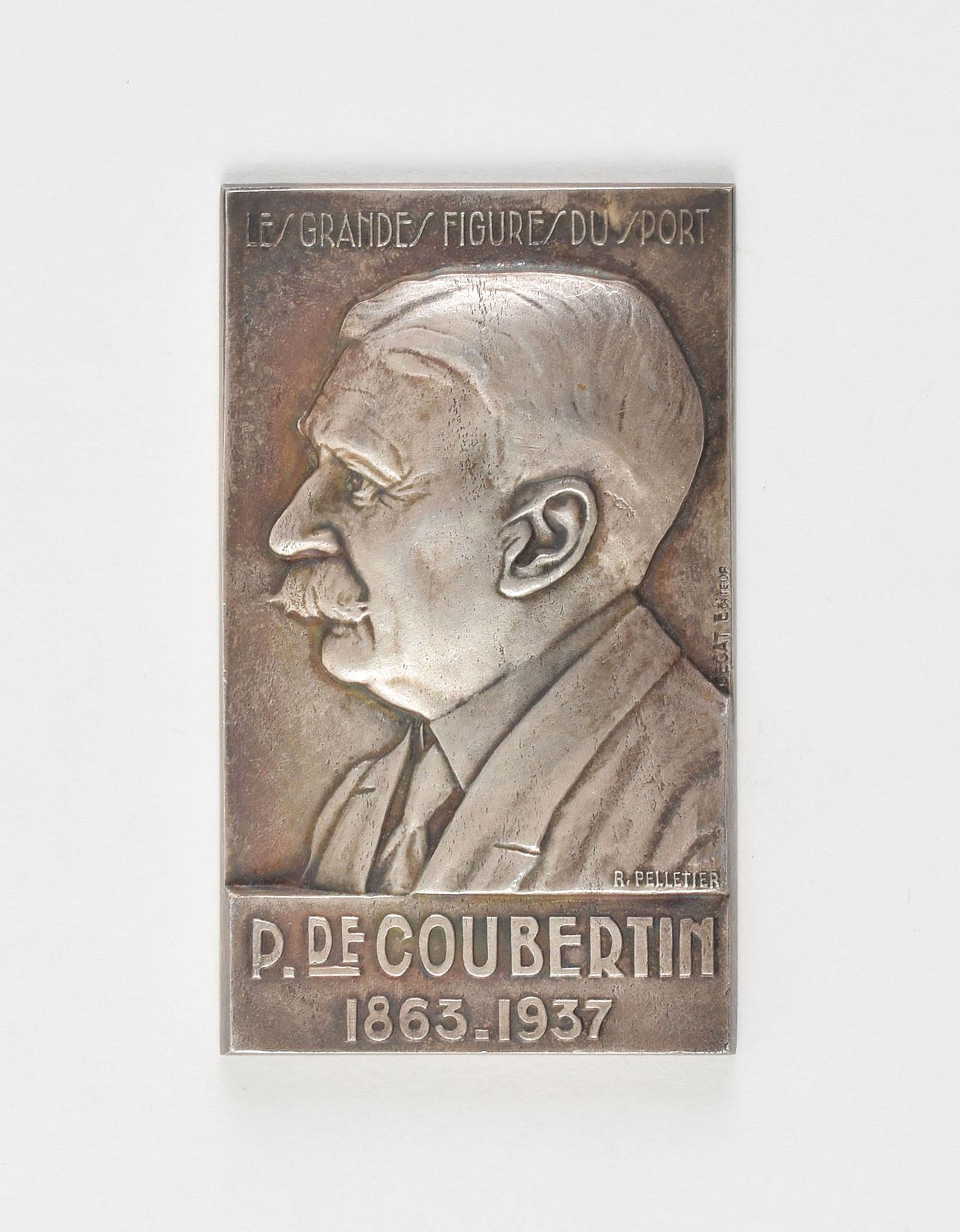 Scarce rectangular medal honoring International Olympic Committee founder Pierre de Coubertin. Silvered bronze, 52 mm x 90 mm, 213 gm, by R. Pelltier for Decat. The front features a portrait of Coubertin in profile and reads, "Les Grandes Figures du Sport, P. de Coubertin, 1863–1937"; the reverse reads, "Renovateur des Jeux Olympiques."