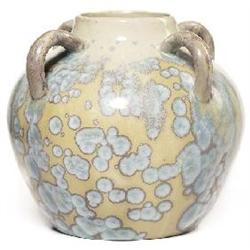 Pierrefonds vase, attribution, four handled shape covered with a spectacular tan and brown glaze with huge turquoise and brown crystals, marked France and numbered, 6.5”h, minor firing flaw to side of base