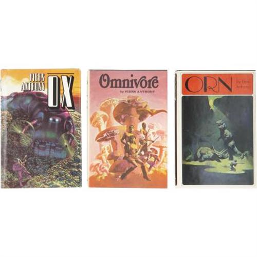 <B>Piers Anthony</B></I>. <B>Three "Of Man and Manta" Series Book Club First Editions</B></I>, including: <B><I>Omnivore</B></I></B></I>. New York: Ballantine Books [1968]. Octavo. 191 pages, untrimmed. Blue binding with white spine titles. Overall fine. Dust jacket is fine with clipped lower corner on front flap. [and:] <B><I>0X</B></I></B></I>. Garden City, N.Y.: Nelson Doubleday, Inc. [1976]. Octavo. 216 pages, untrimmed. Brown binding with dark brown spine titles. Book and dust jacket are fine. [and:] <B><I>Orn</B></I></B></I>. Garden City, N.Y.: Nelson Doubleday, Inc. [1977]. Octavo. 247 pages, untrimmed. Black binding with red spine titles. Fine. These three volumes comprise Anthony's entire "Of Man and Manta" series. <I>From the Robert and Diane Yaspan Collection.</B></I><BR><BR><b>Shipping:</b> Books & Catalogs (<a target="_blank" href="http://www.heritageauctions.com/common/shipping.php">view shipping information</a>)