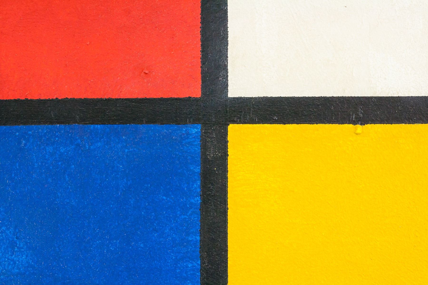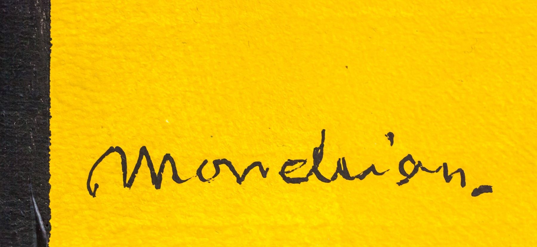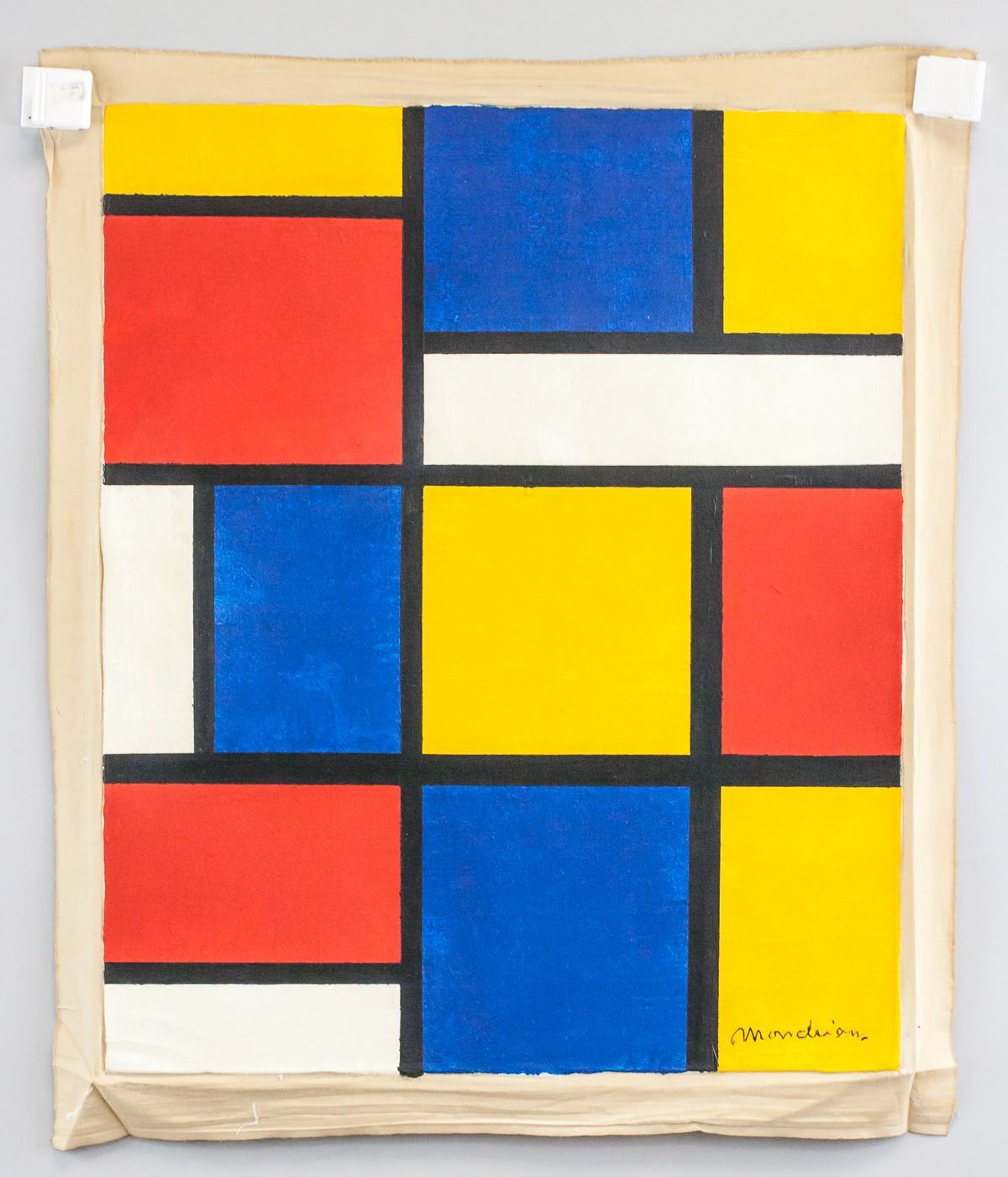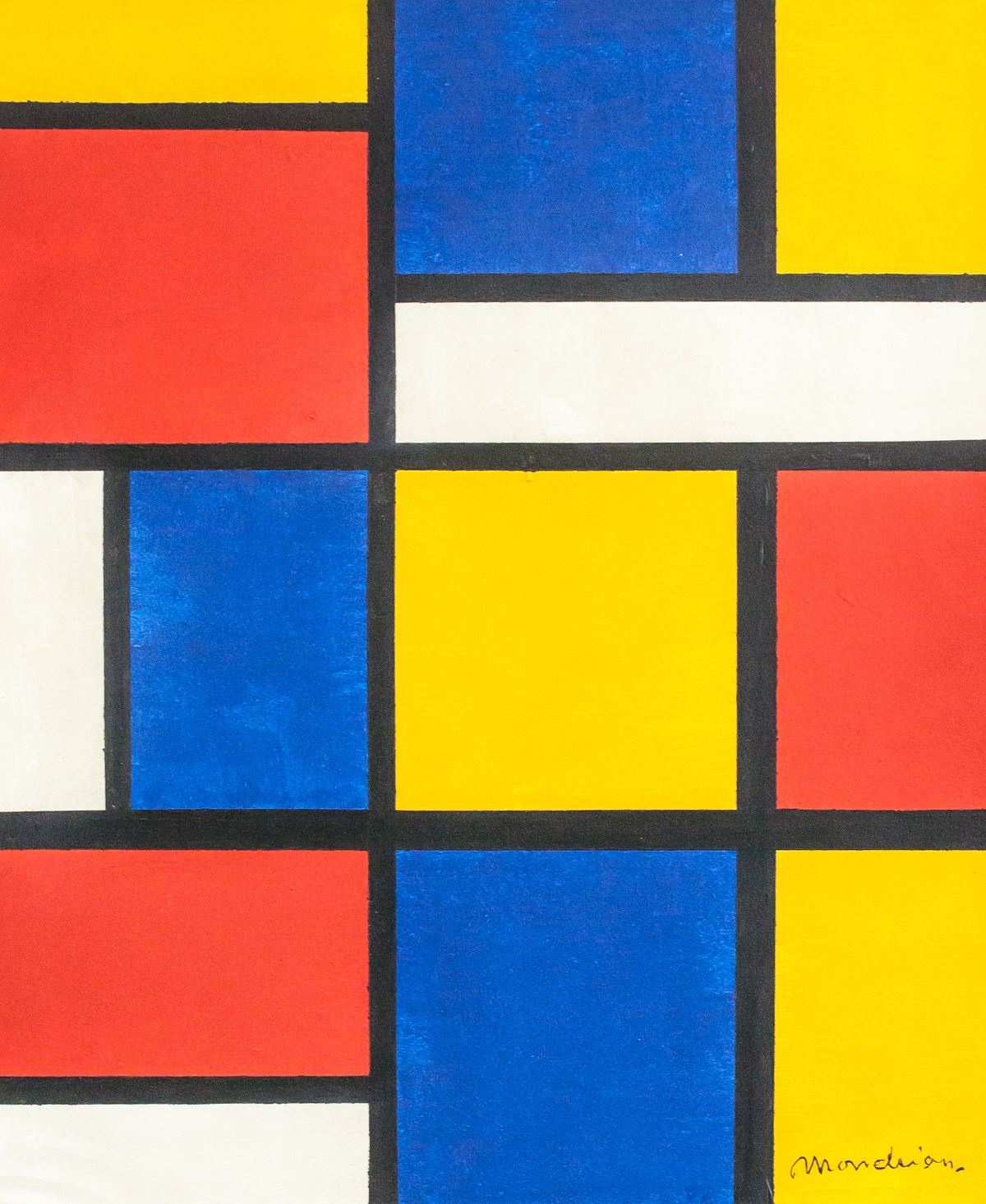 Acrylic on canvas. Featuring red, blue, yellow, and white with black borders. Signed Mondrian on the lower right corner. Attributed to Piet Mondrian (1872-1944, Dutch). 60 x 49 cm (23.75 x 19.5 inches).. Provenance: This lot carries limited provenance from a Southern Italian estate