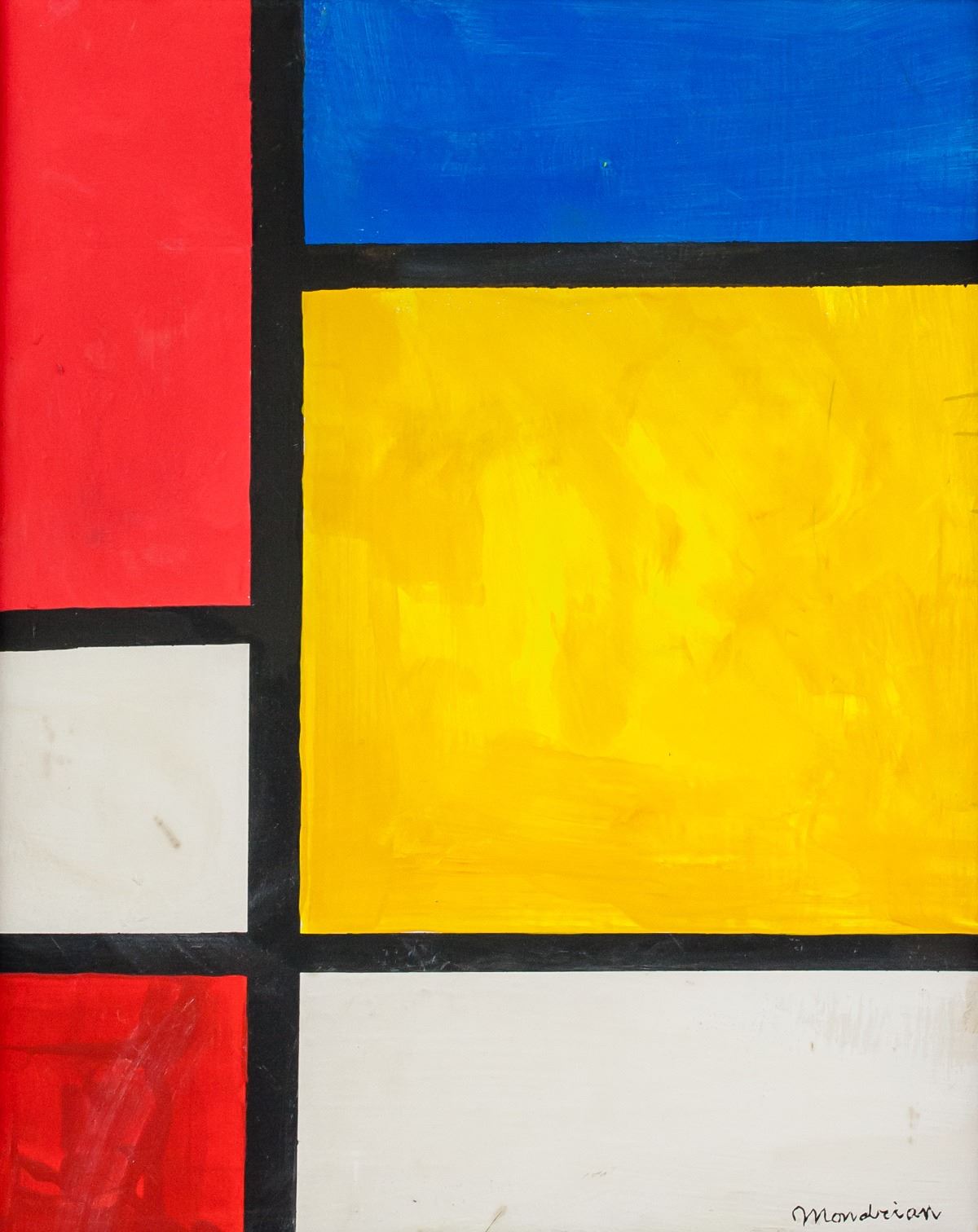 Oil on canvas, framed. Featuring an abstract expressionist composition of red, blue, yellow, and white outlined in black. Signed mondrian on the lower right corner. Attributed to Piet Mondrian (1872-1944, Dutch). 50 x 40.5 cm (20 x 16 inches). Framed size: 57.5 x 47 cm (22.5 x 18.5 inches). PROVENANCE: Southern Ontario estate