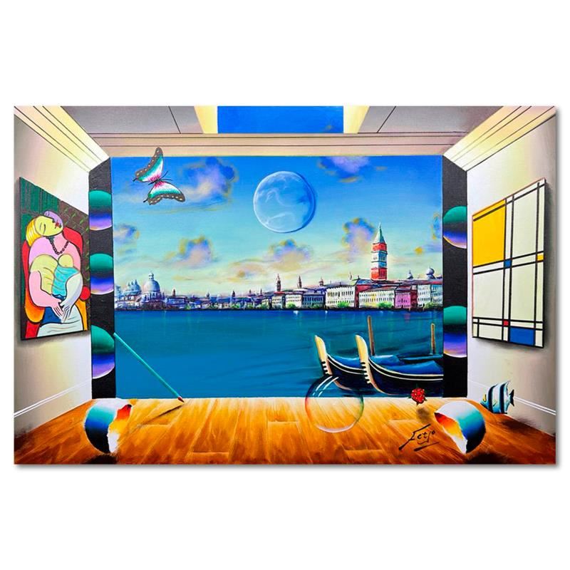 "Piet & Picasso in Venice" is an original painting, oil on stretched canvas, by Ferjo. Hand signed by the artist, this piece comes with a letter of authenticity. Measures approximately 24" x 36" (image).