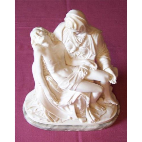 This very nice Pieta, depicting the Virgin Mary holding Christ's body after his death, is signed by Italian Artist Arnaldo Giannelli (A. Giannelli). It is an off-white alabaster sculpture mounted on a marble base. It was purchased in Rome, Italy in the summer of 1974.