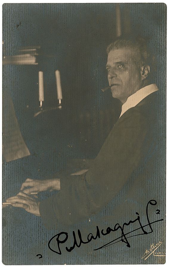 Italian composer (1863–1945) whose 1890 masterpiece ‘Cavalleria rusticana’ takes a place among the most beloved staples of the operatic repertoire. Vintage matte-finish 3.25 x 5.5 photo of Mascagni seated at a piano, signed in fountain pen, “P. Mascagni.” Photo is affixed to a 5 x 7 board. Moderate silvering to darker areas of image and background, otherwise fine condition.