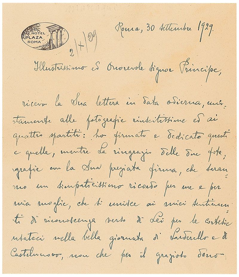 Italian composer (1863–1945) whose 1890 masterpiece ‘Cavalleria Rusticana’ takes a place among the most beloved staples of the operatic repertoire. Untranslated ALS in Italian, three pages on two adjoining sheets, 6 x 6.75, Hotel Plaza Roma letterhead, September 30, 1929. In fine condition.