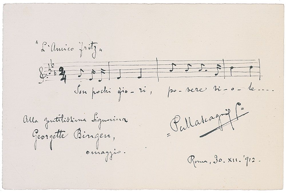 Italian composer (1863–1945) whose 1890 masterpiece ‘Cavalleria Rusticana’ takes a place among the most beloved staples of the operatic repertoire. AMQS on an off-white 7.75 x 5.25 sheet. Mascagni pens four bars of music and lyrics to his 1891 opera ‘L’amico Fritz,’ writing the title at the top, signed and inscribed under the quote in Italian, and dated “Roma, 30.XII. ’912.” In fine condition.
