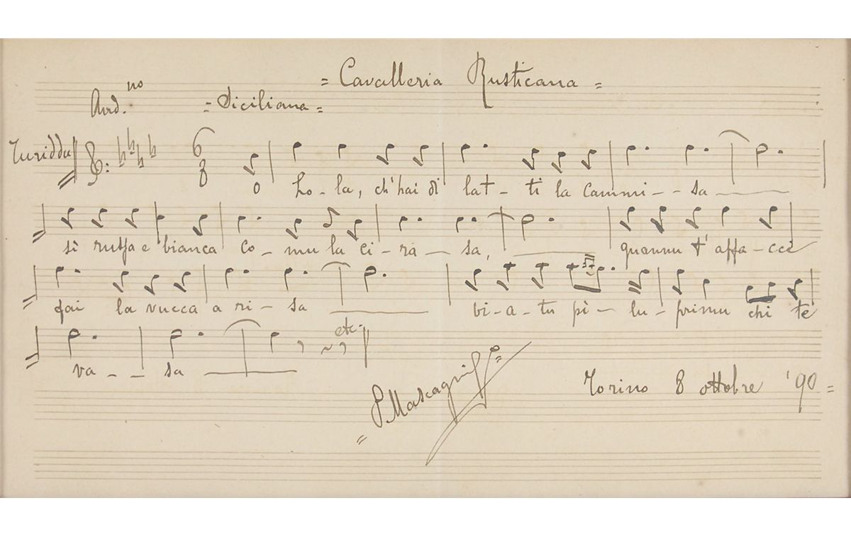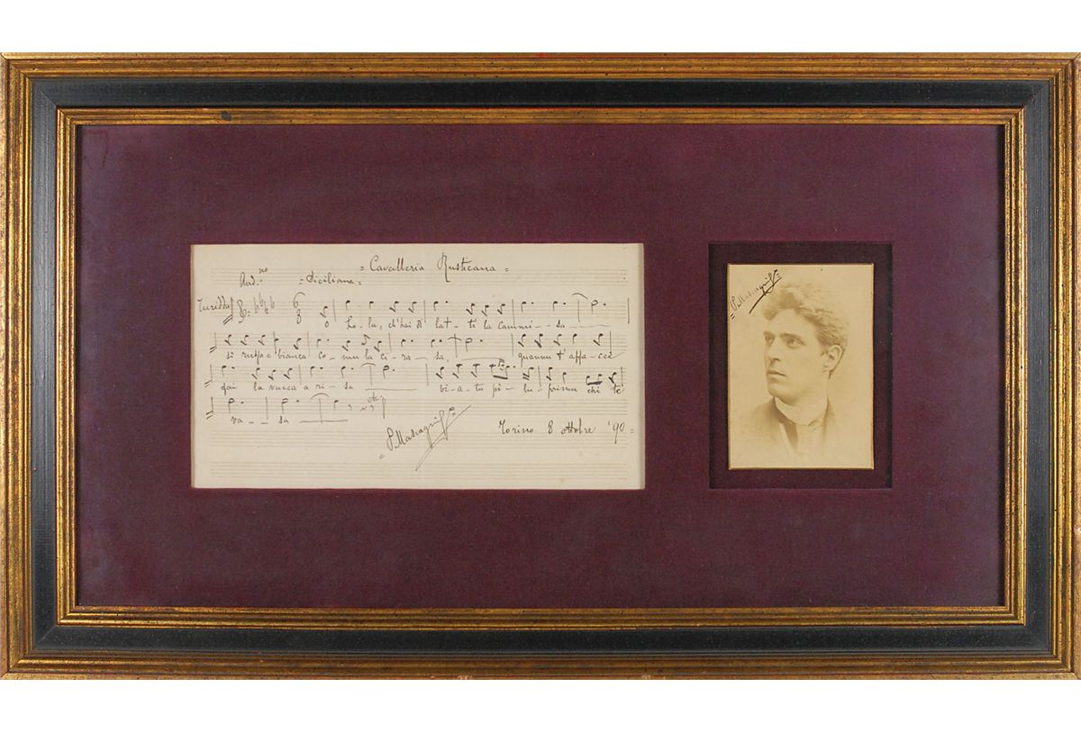 Lengthy AMQS on an 11 x 6 off-white musically-lined sheet. Mascagni pens an incredible 14 bars of music and lyrics from his opera ‘Cavalleria Rusticana,’ writing the title at the top, and signing along the bottom, “P. Mascagni, Morino, 8 Octobre ’90”; and a 3.5 x 5 matte-finish photo of a young Mascagni, nicely signed in black ink, “P. Mascagni.” Both are cloth-matted and framed together to an overall size of 26.5 x 15.5. In fine condition, with a light central vertical fold to quote passing through a single letter of signature, and slightly trimmed edges to photo. Considered one of the classic verismo operas, ‘Cavalleria Rusticana’ premiered only six months before the composer penned this superb quote. Oversized.