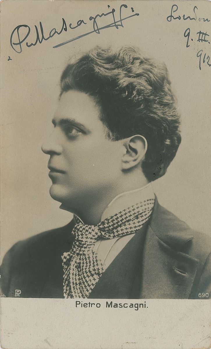 Italian composer (1863–1945) whose 1890 masterpiece ‘Cavalleria rusticana’ takes a place among the most beloved staples of the operatic repertoire. Handsome 3.25 x 5.5 postcard photo of the composer in profile, signed in black ink, “P. Mascagni, London, 9. III. 912.” In fine condition.